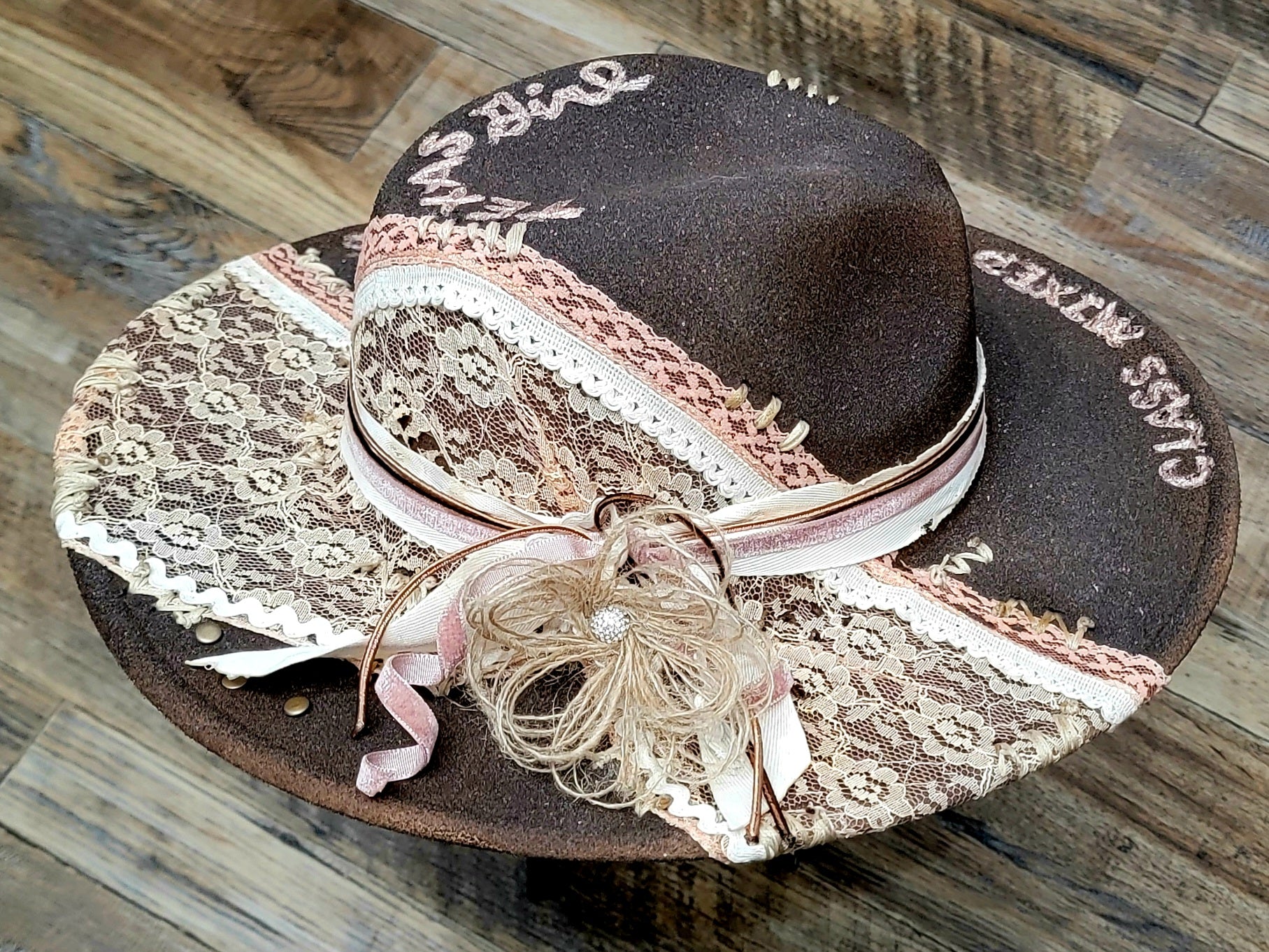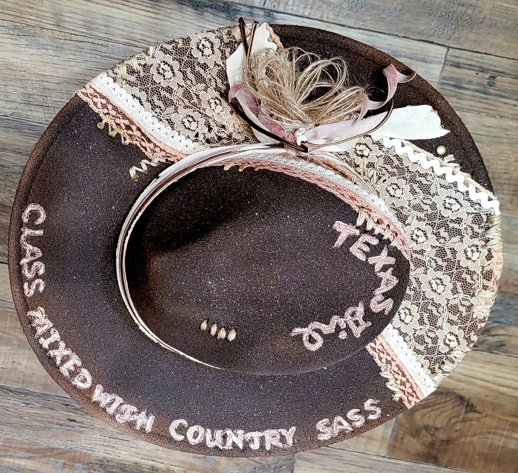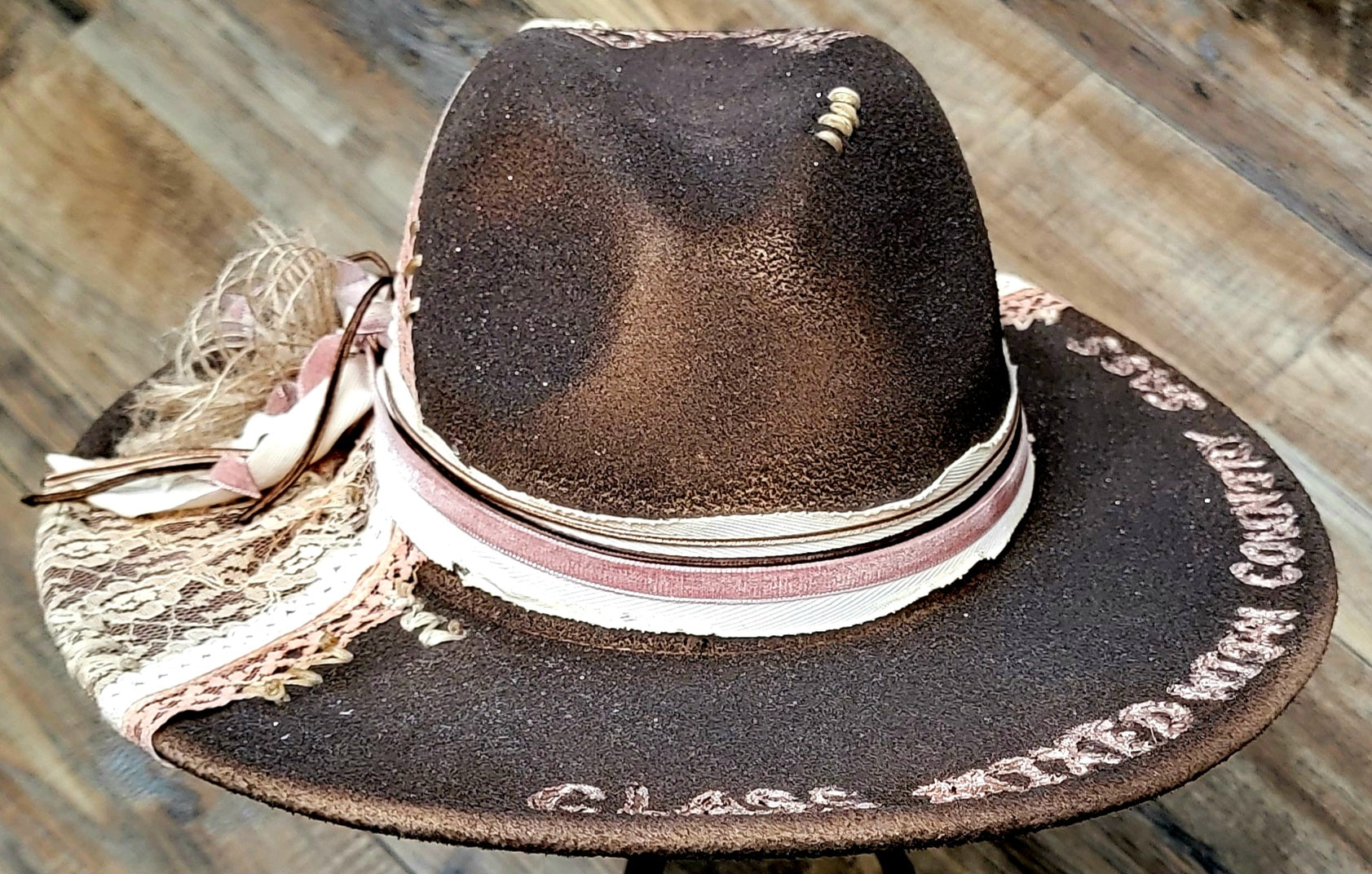 Bold, feminine, and unapologetically countryâthis custom-crafted hat embodies the true spirit of a Texas girl. The deep chocolate-brown base is hand-burned for a rustic yet refined finish, then dressed with panels of delicate vintage lace in cream and blush tones. Soft pink and ivory ribbons wrap gracefully around the crown, accented with a handcrafted bow and natural twine flower for a touch of country chic.