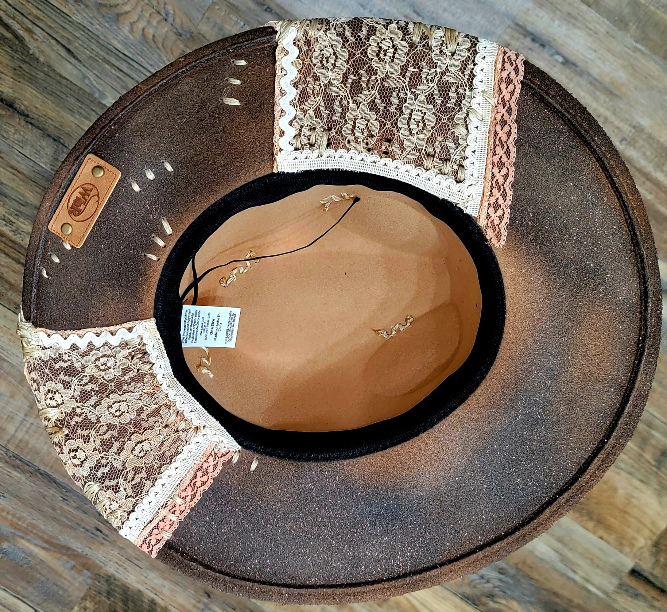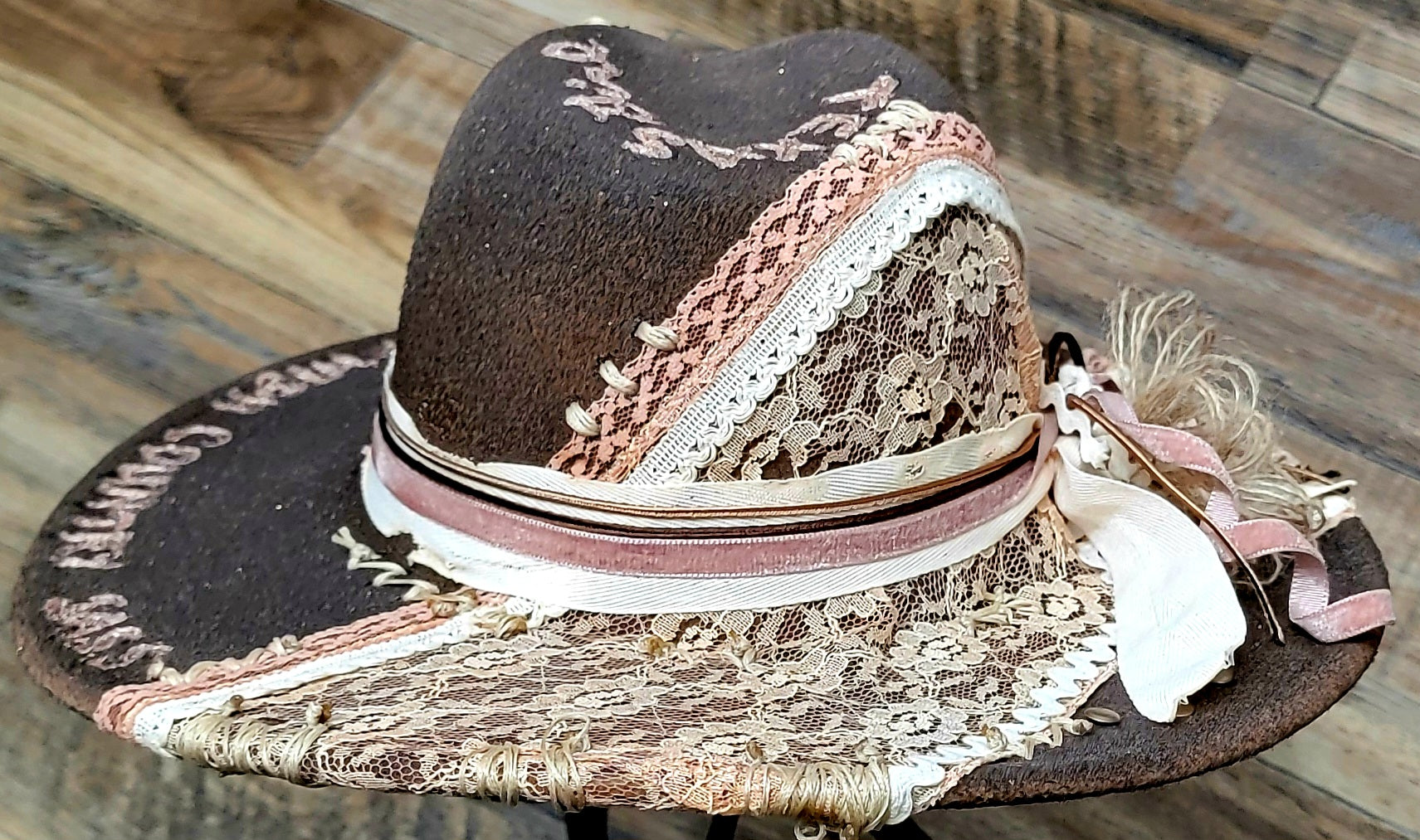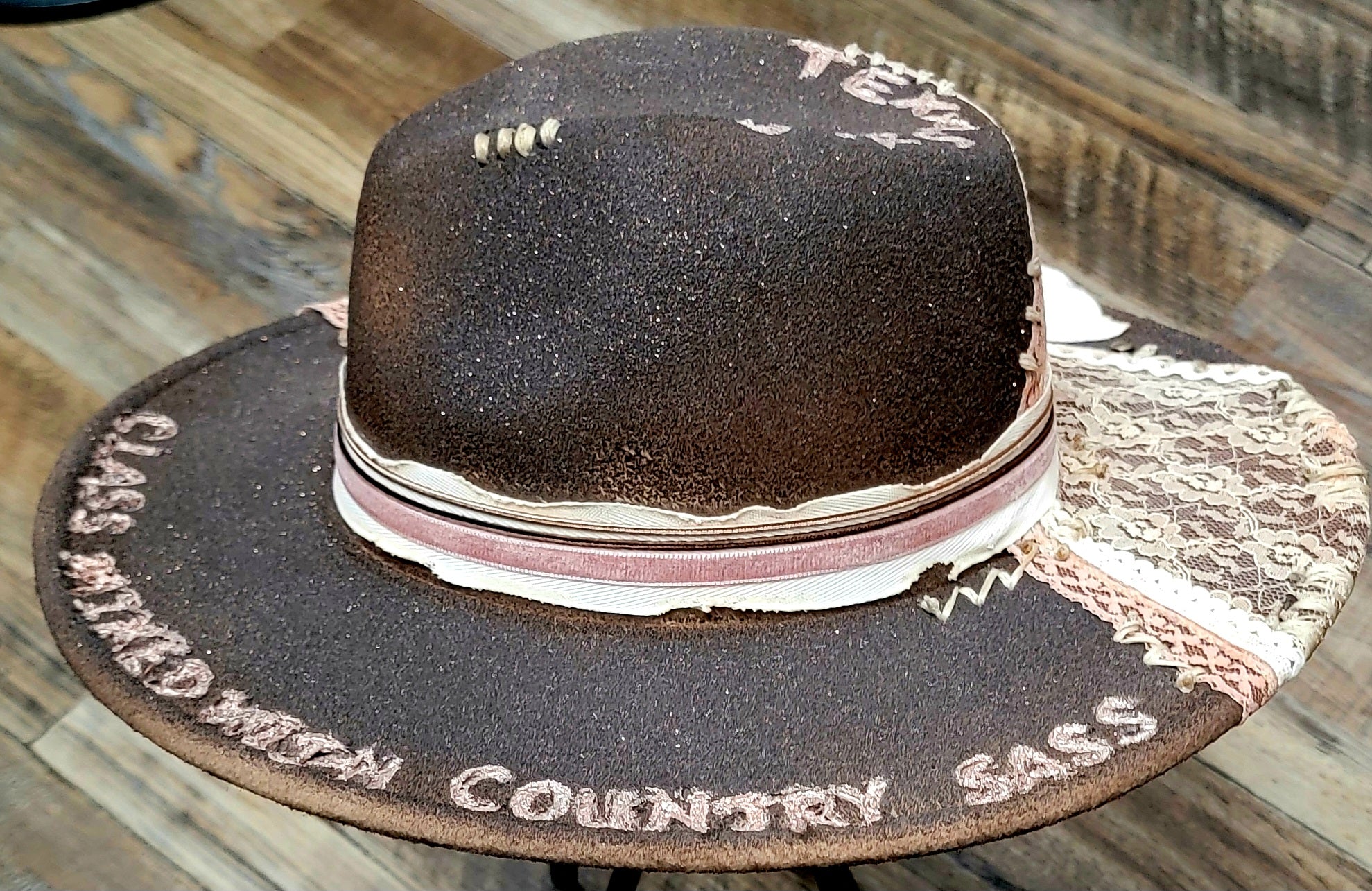 Bold, feminine, and unapologetically countryâthis custom-crafted hat embodies the true spirit of a Texas girl. The deep chocolate-brown base is hand-burned for a rustic yet refined finish, then dressed with panels of delicate vintage lace in cream and blush tones. Soft pink and ivory ribbons wrap gracefully around the crown, accented with a handcrafted bow and natural twine flower for a touch of country chic.