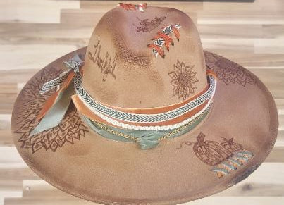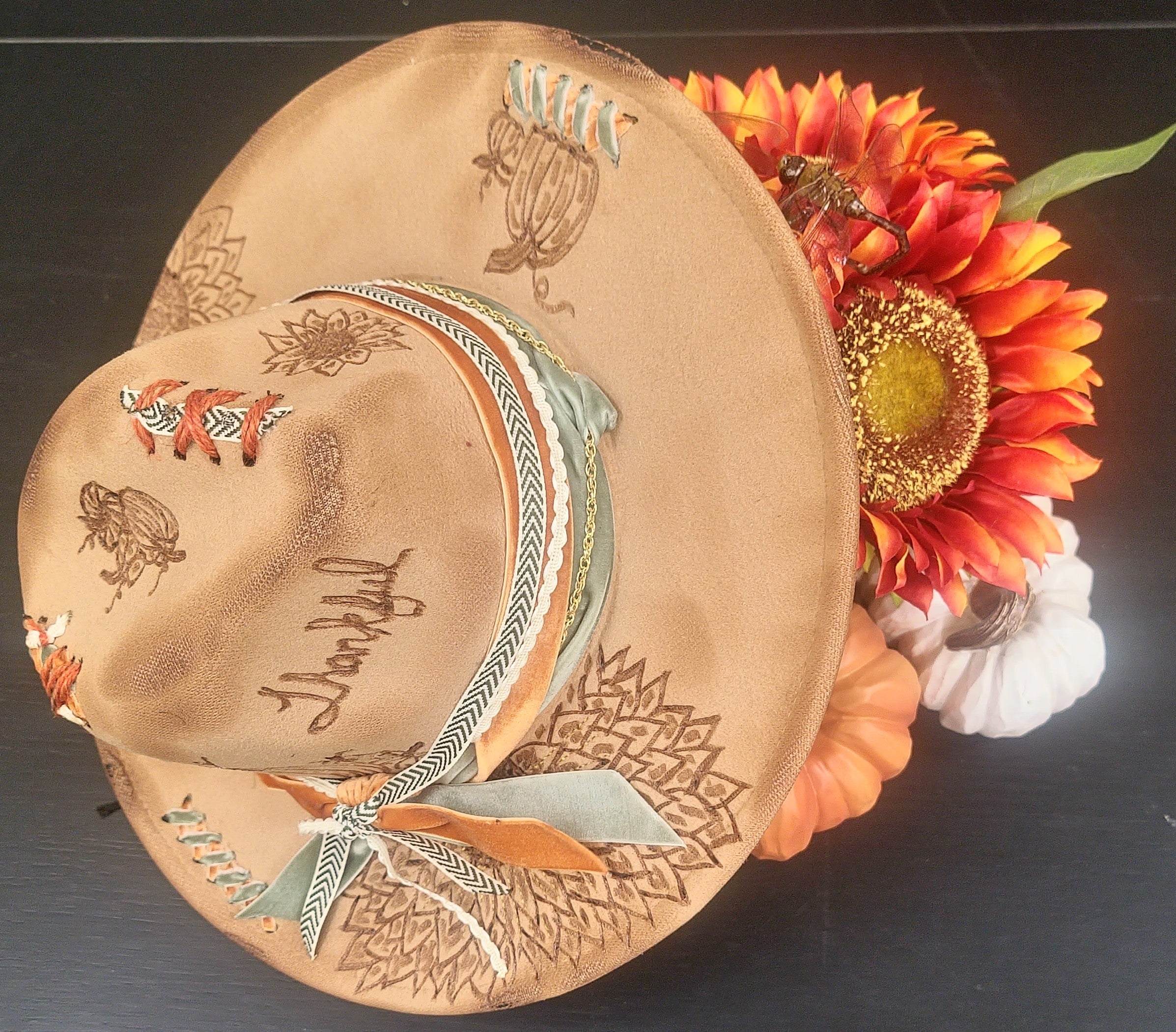 Our Thankful hat is a celebration of gratitude and the beauty of autumn. Crafted in a soft, earthy poly-blend, this design is detailed with delicately embroidered fall motifs โ from intricate pumpkins to rustic florals โ that are placed gracefully around the crown and brim. Hand-stitched accents add a touch of artisanal charm, while layered ribbons and textured trims in warm harvest hues complete the look.