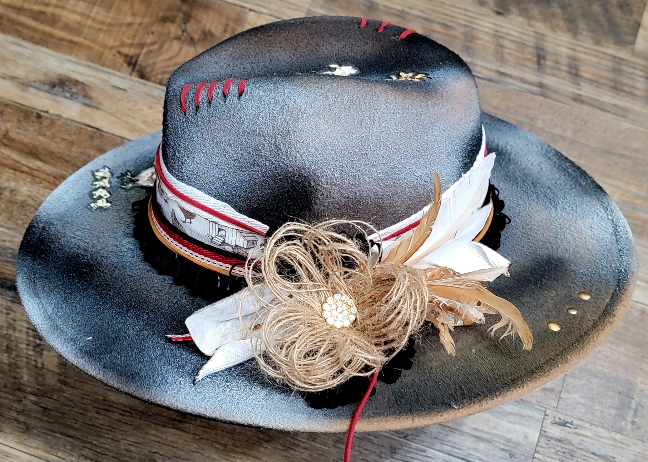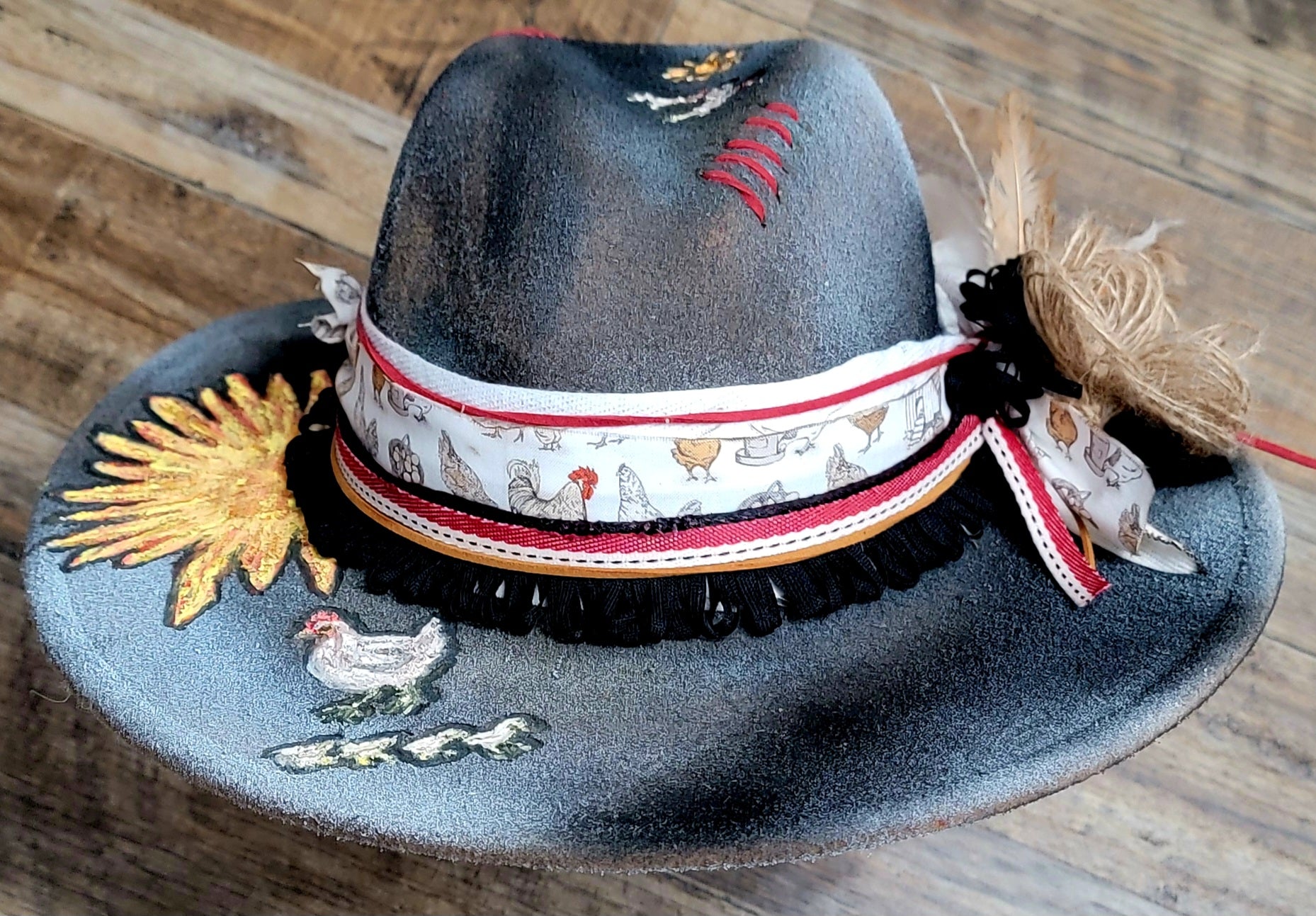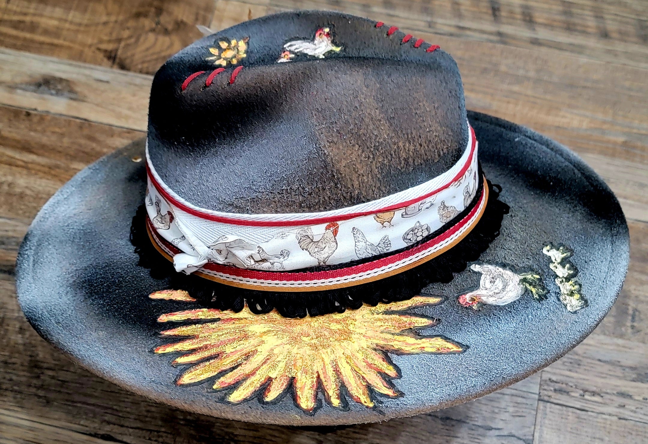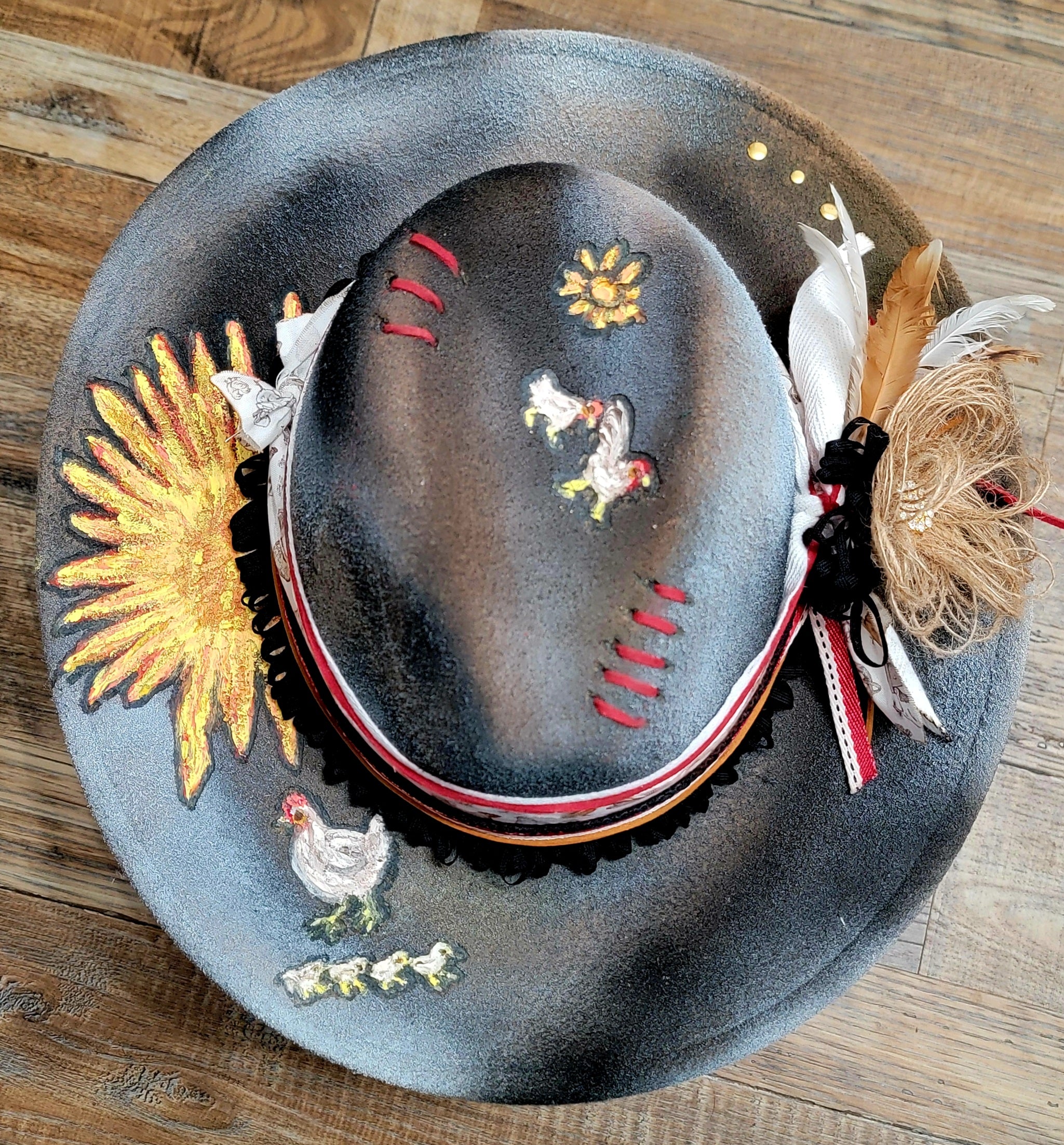 Every stroke, burn, and embellishment is freehand, making this hat truly one of a kind—a wearable piece of art that blends country living with whimsical personality.