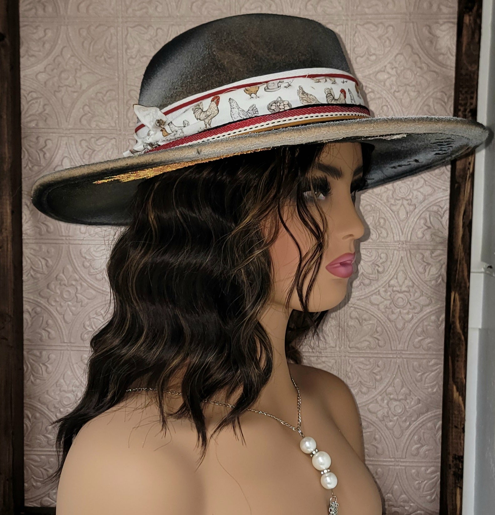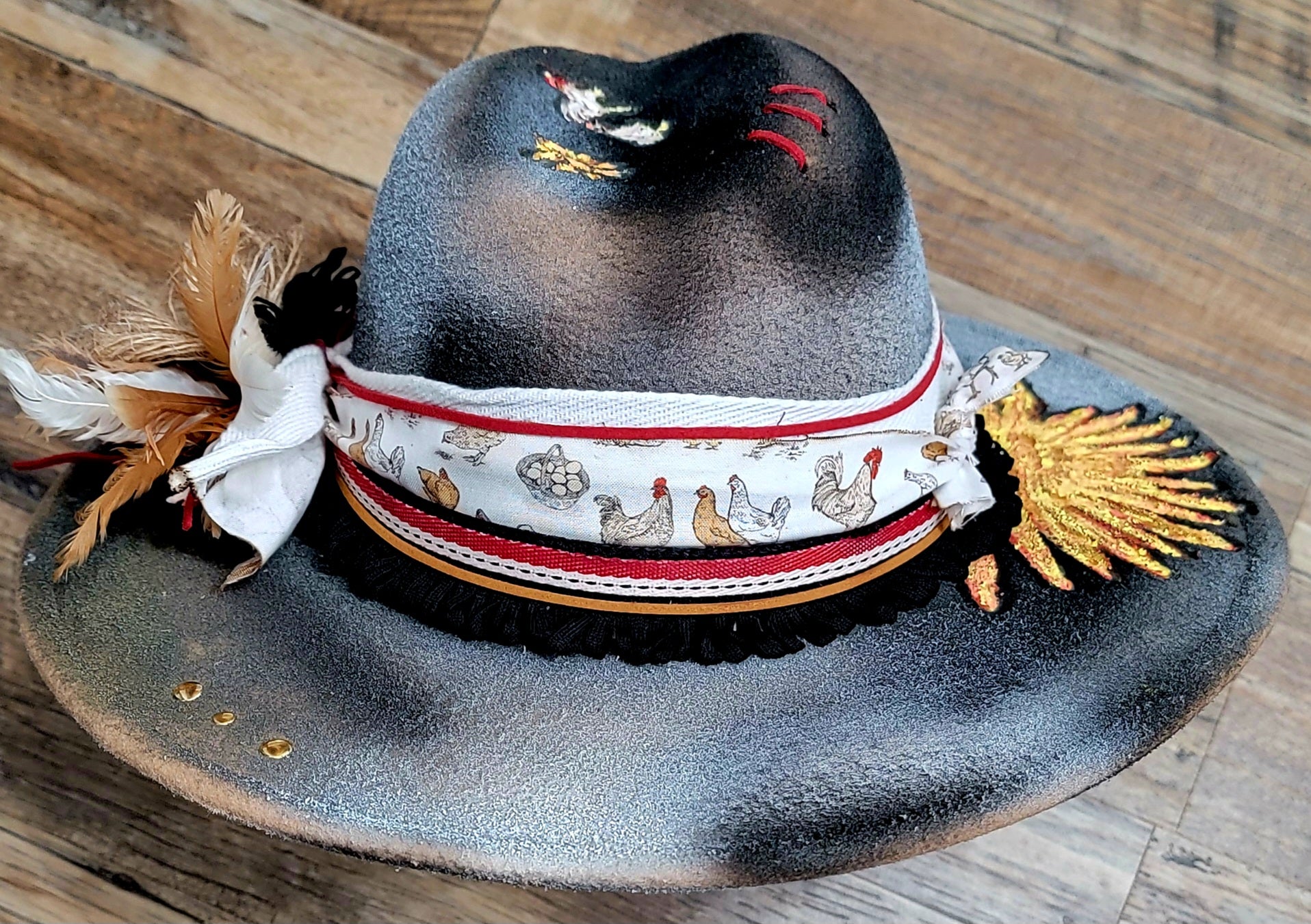 Hatband details – A layered hatband combines chicken-print fabric with textured ribbon, black fringe, and pops of red and gold. On the side, natural feathers, rustic twine, and a sparkling center detail form a statement accent flower.