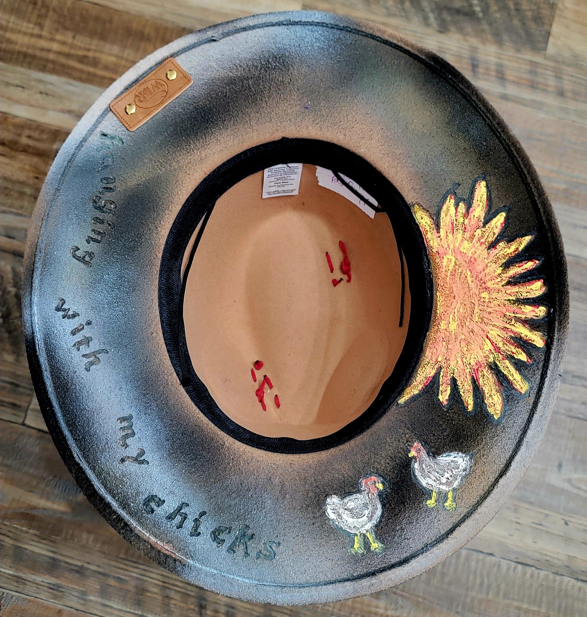 Playful underside – The inside brim continues the design story with more chickens and sunflowers, alongside the hand-burned phrase “Hanging with my chicks,” tying in the fun, lighthearted theme.