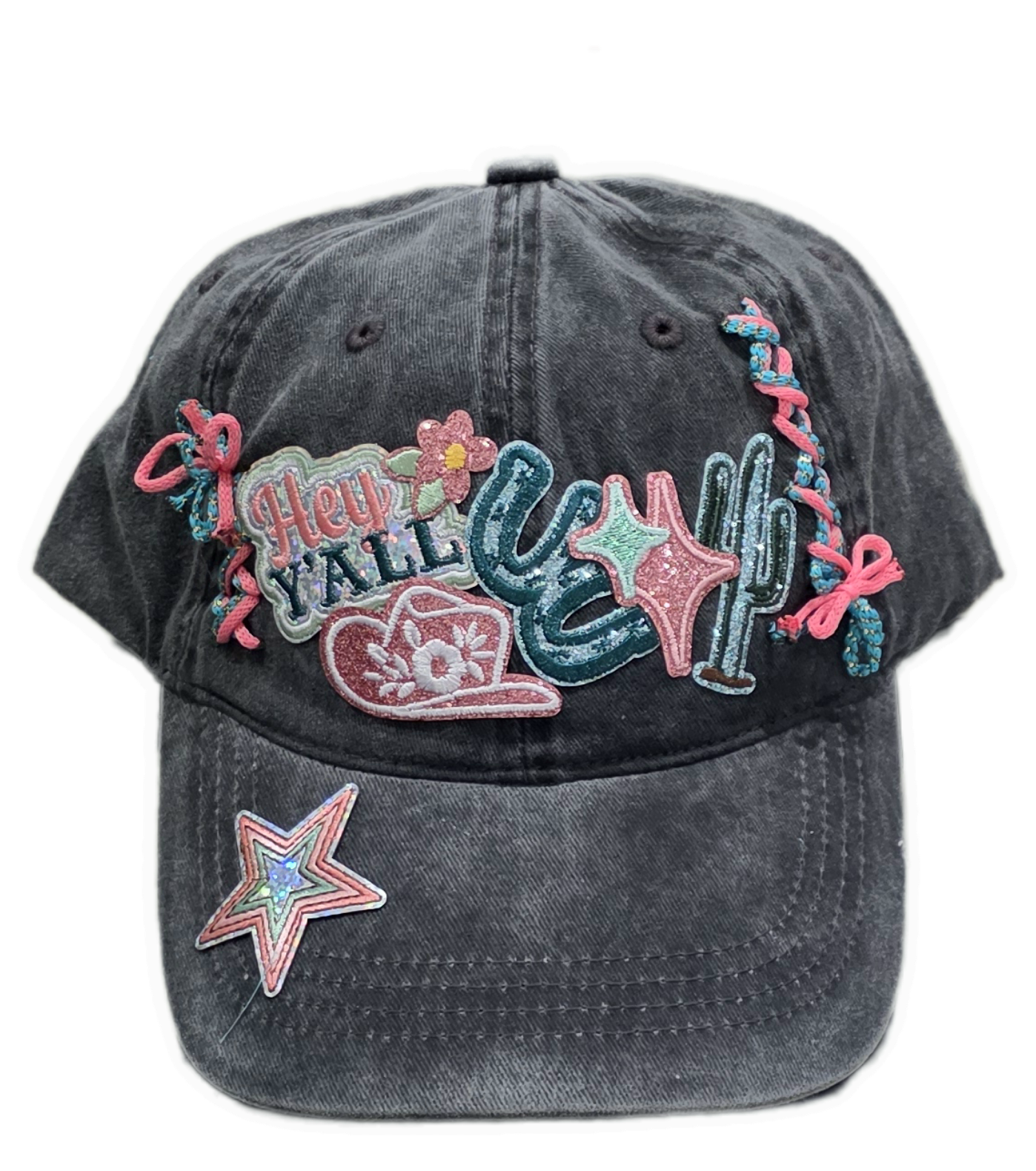Kick up some country charm with our Hey Y’all Baseball Cap — where southern sass meets handcrafted flair! This vintage-washed black cap features colorful embroidered patches of cacti, stars, and a pink cowgirl hat, finished with hand-laced ribbon details that give it that one-of-a-kind Brim & Burn touch.