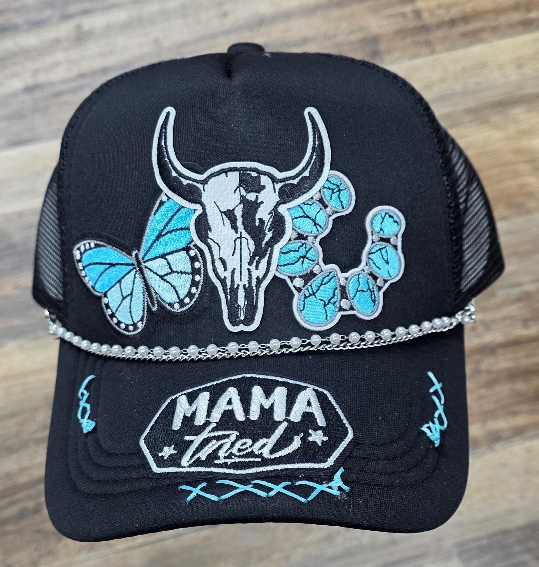 Featuring a striking bull skull centerpiece, turquoise butterfly and cactus details, and a pearl chain accent across the brim, this hat is made for mamas with edge and hearts that won’t be tamed. It’s equal parts tough, feminine, and unapologetically country.