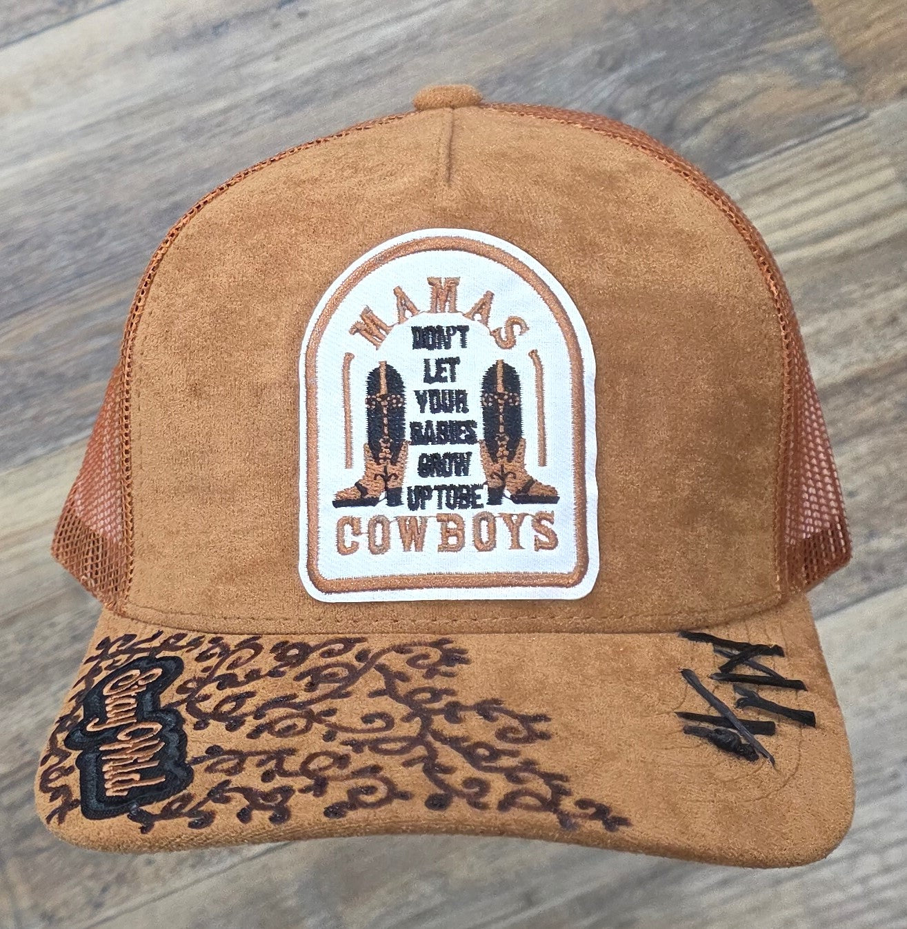 The Mamas Don’t trucker hat brings classic western roots with a modern edge. Featuring a bold patch design that reads “Mamas don’t let your babies grow up to be cowboys” with worn–in suede-style texture, rugged stitching, and hand-styled detailing on the brim, this hat tells a story before you ever say a word.