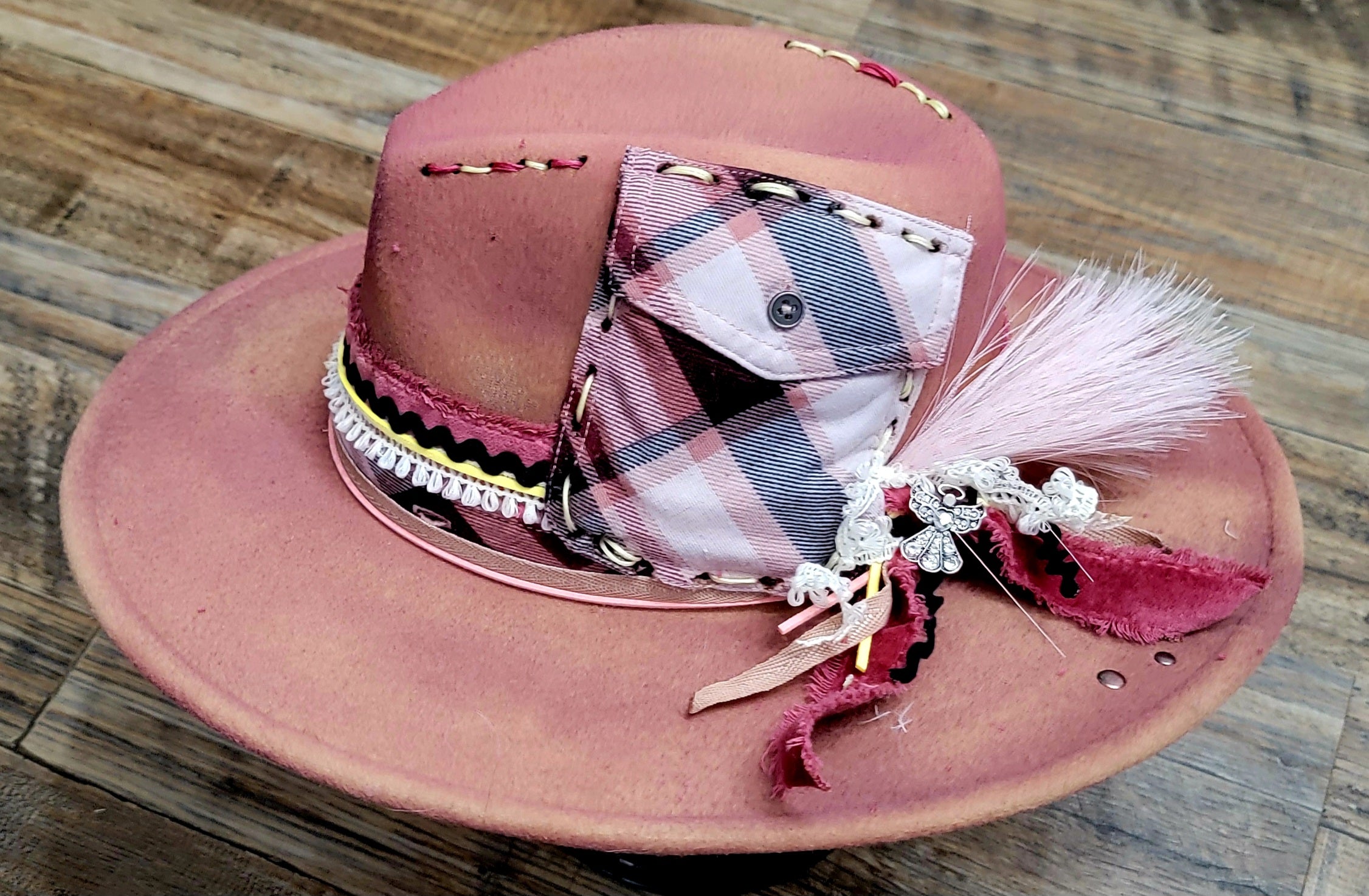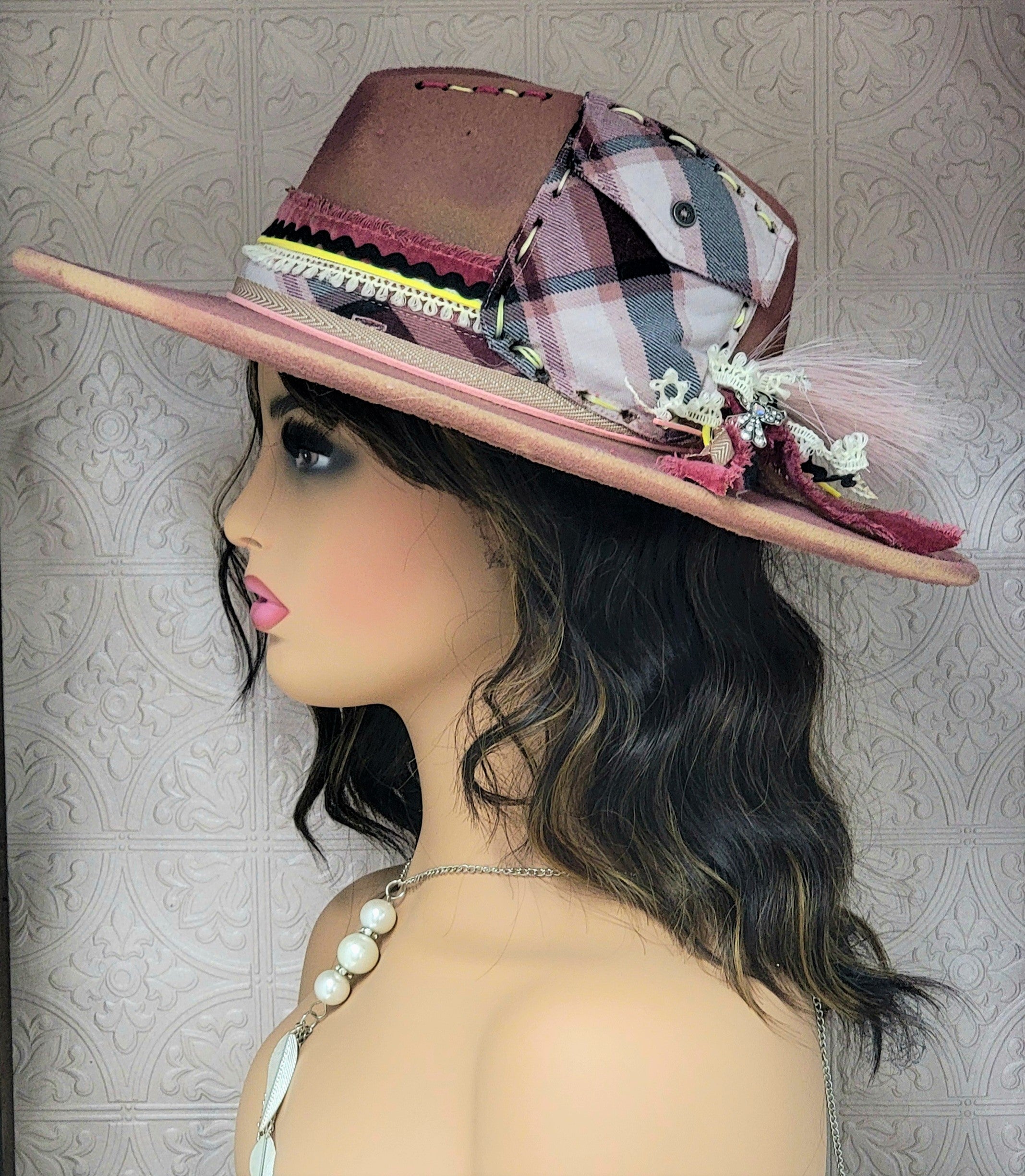 The show-stopping detail? A plaid fabric pocket stitched onto the crown — both a quirky surprise and a nod to nostalgia. A delicate arrangement of lace, ribbon, feathers, and charms blooms beside it, adding texture and movement.