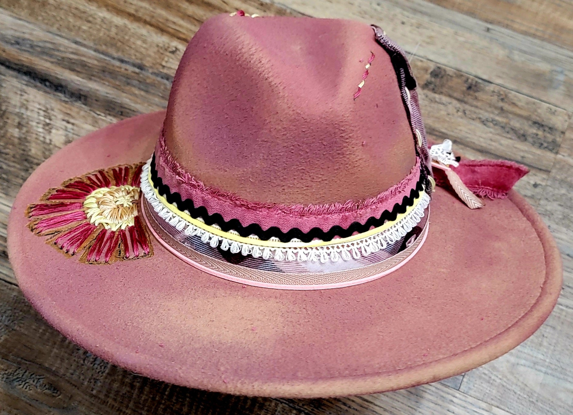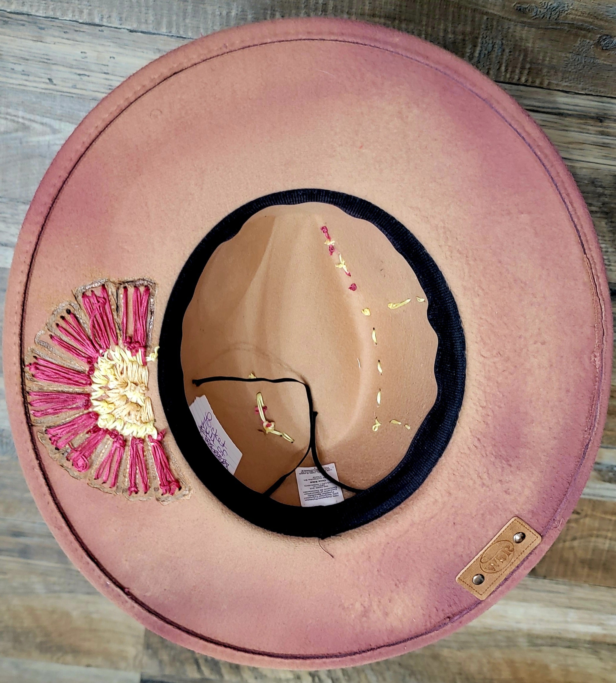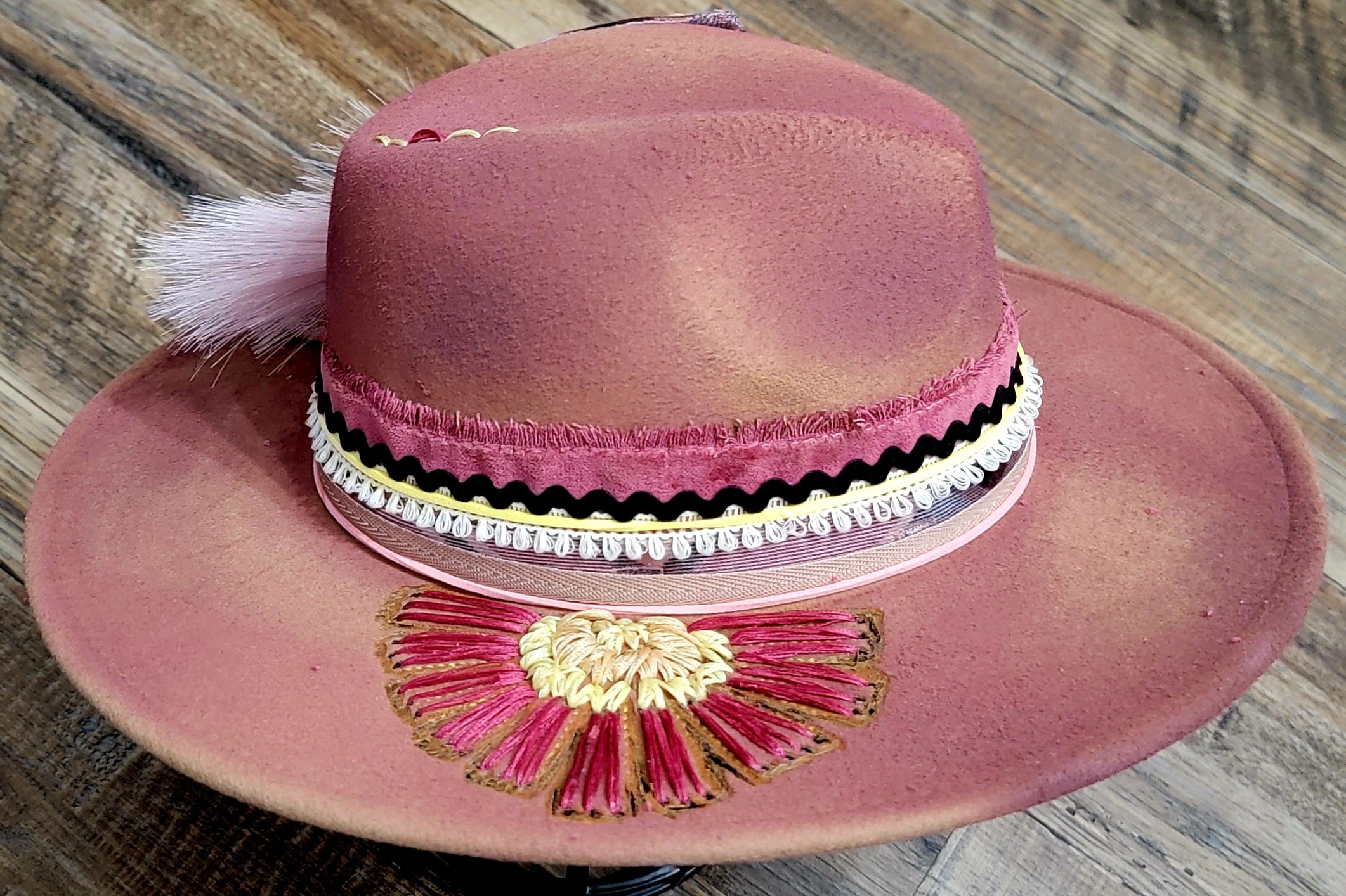 This soft blush-pink felt hat is hand-detailed with vibrant embroidery, featuring a radiant daisy blooming across the brim, symbolizing warmth and cheer. The crown is accented with rustic cross-stitching, giving it a handcrafted, storybook feel. Around the band, layers of pink, cream, black, and yellow trims weave together for a lively, eclectic touch.