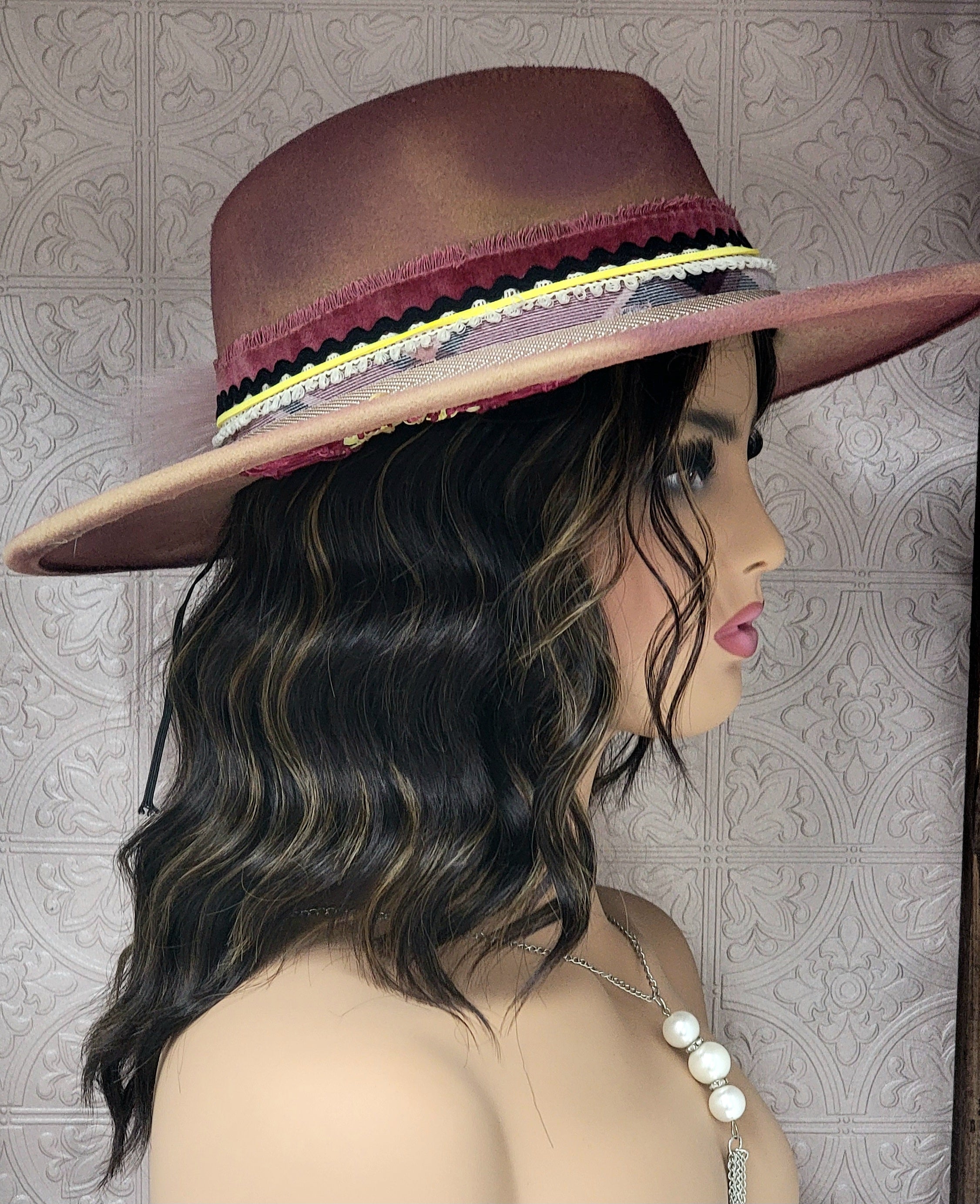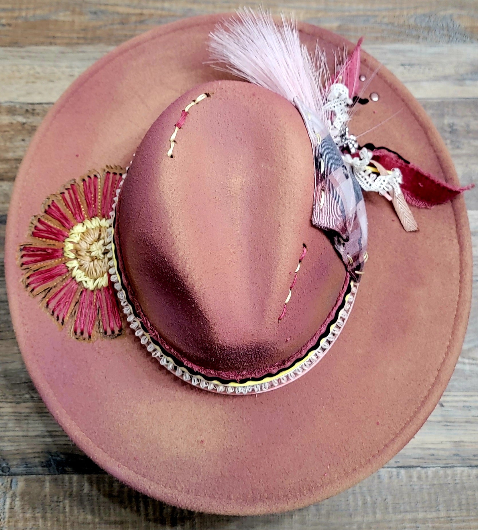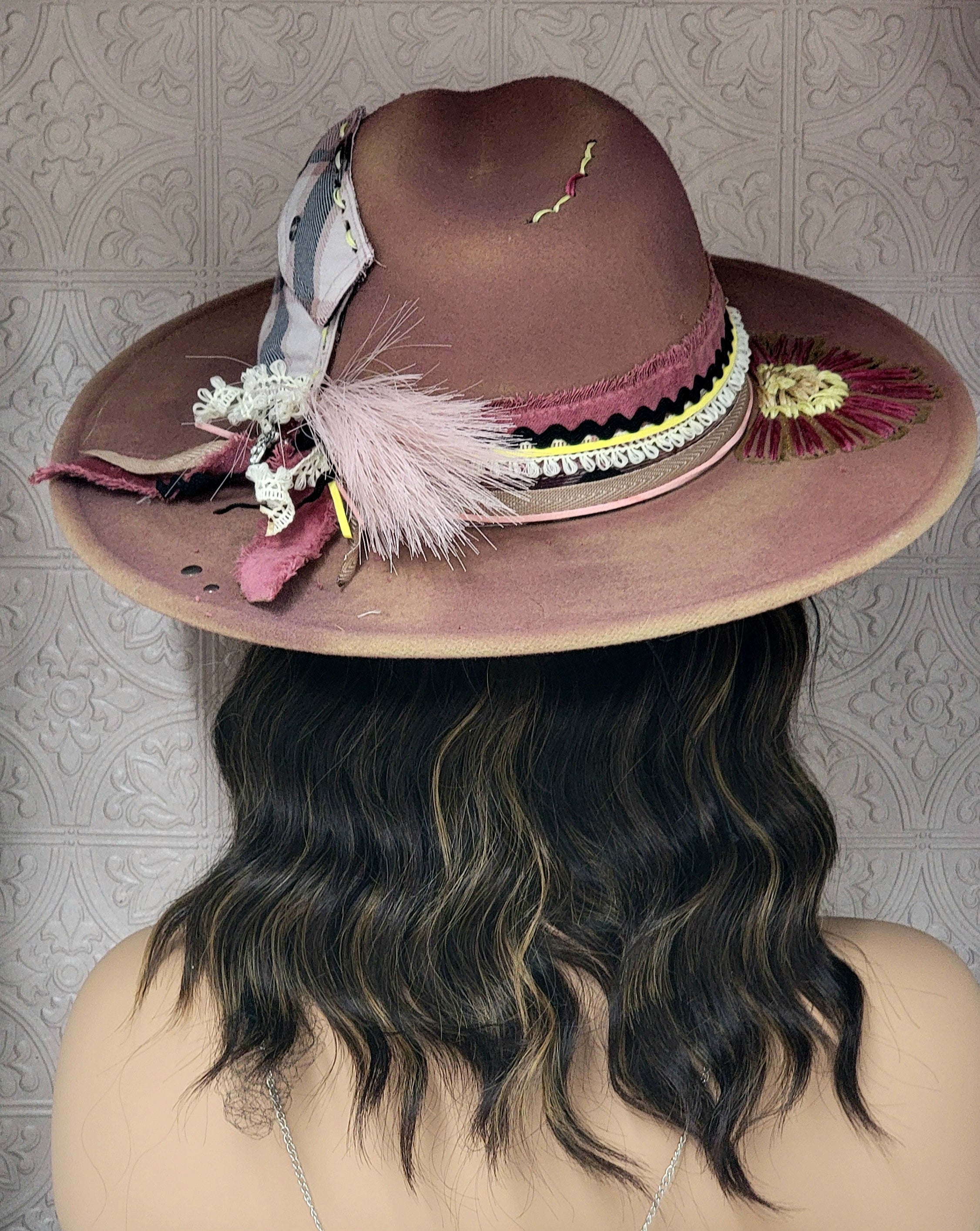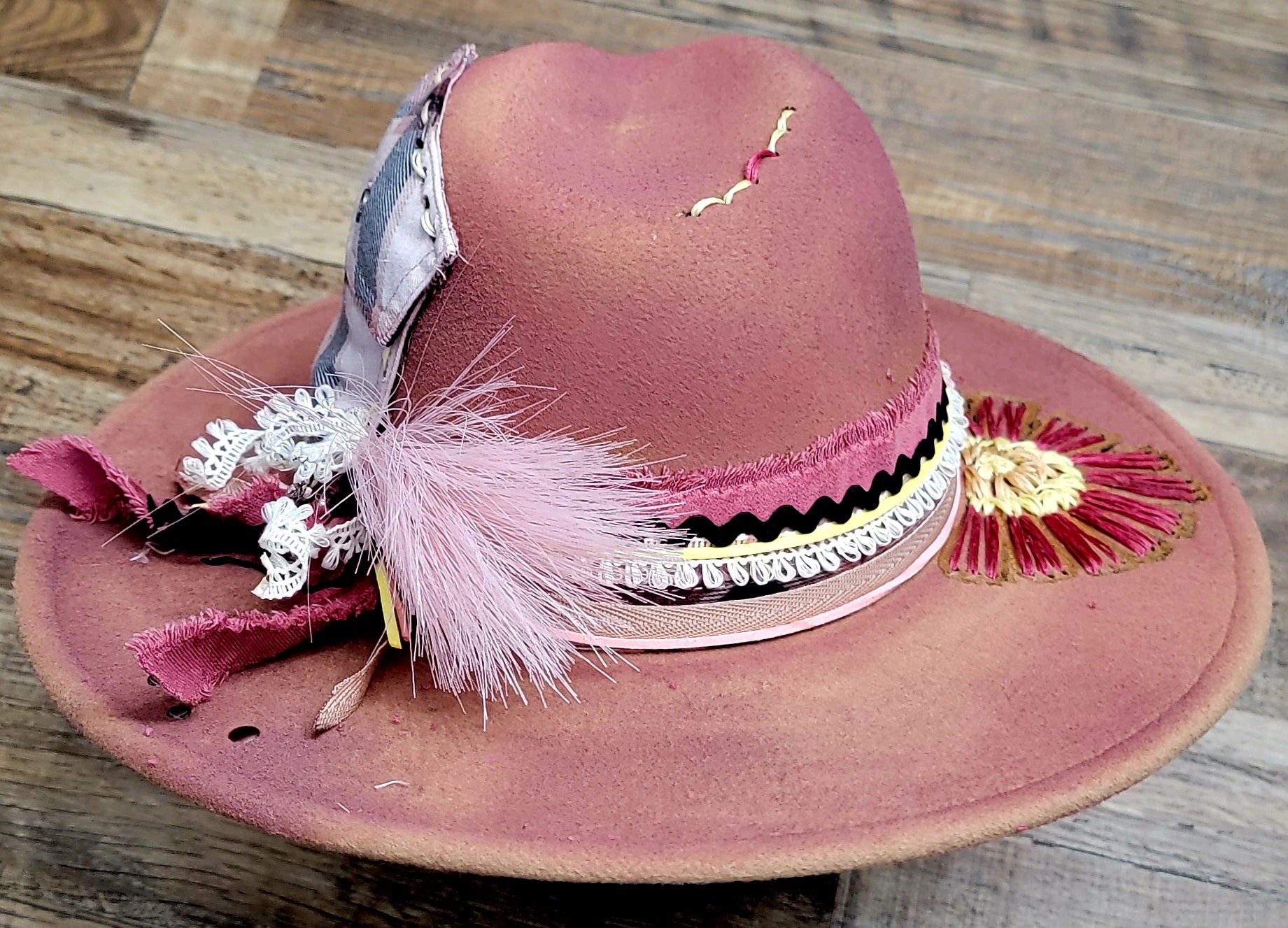This soft blush-pink felt hat is hand-detailed with vibrant embroidery, featuring a radiant daisy blooming across the brim, symbolizing warmth and cheer. The crown is accented with rustic cross-stitching, giving it a handcrafted, storybook feel. Around the band, layers of pink, cream, black, and yellow trims weave together for a lively, eclectic touch.