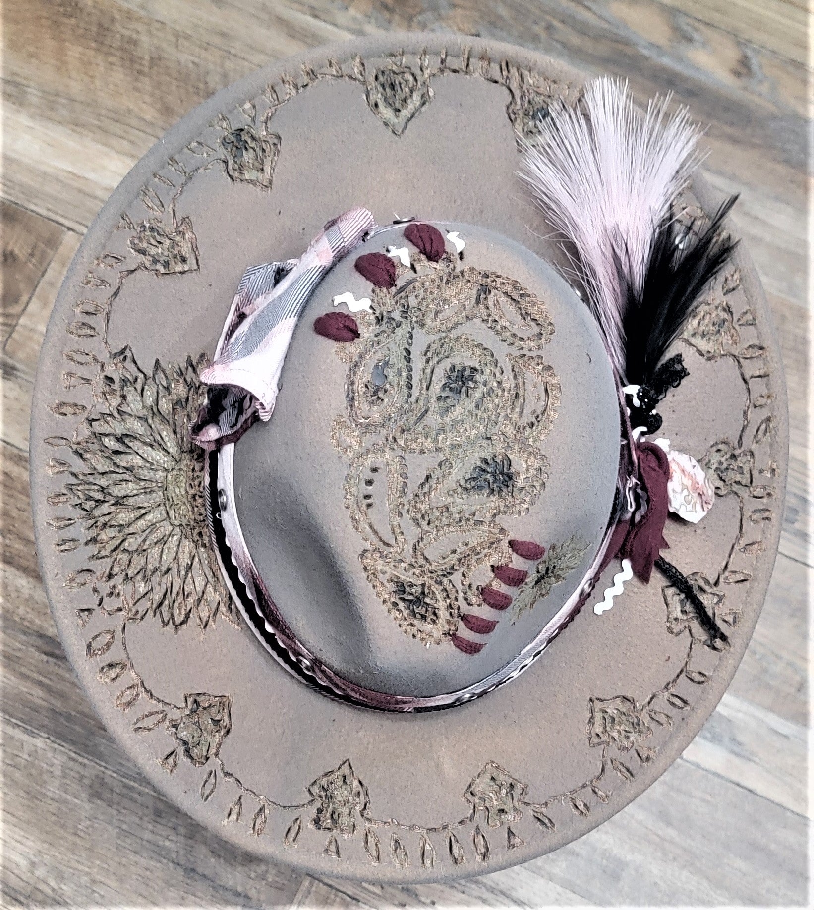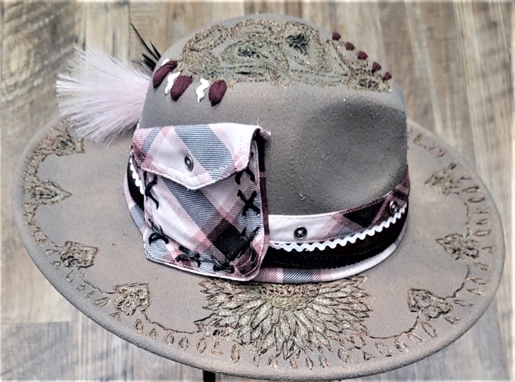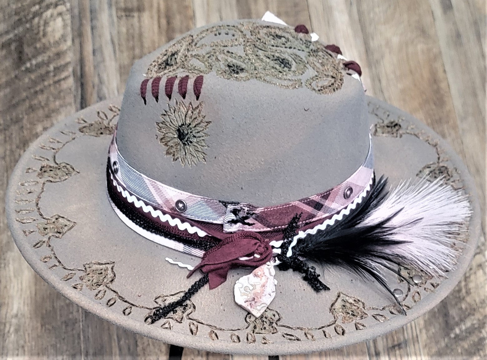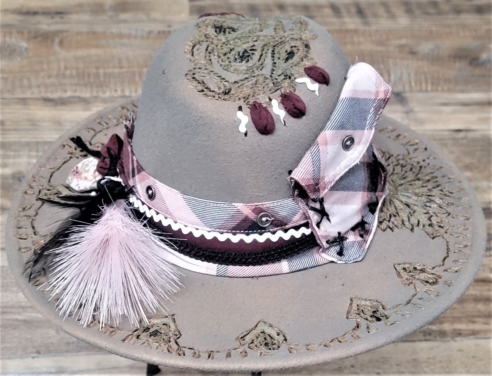 A true statement of rugged elegance, this one-of-a-kind hat blends rustic textures with whimsical accents. Its earthy taupe base is hand-detailed with embroidered floral and paisley-inspired patterns across the crown and brim, giving it a timeless artisanal touch. The hatband features a layered mix of plaid fabric, maroon trim, and classic white rickrack, secured with metallic rivets that add a hint of industrial edge.