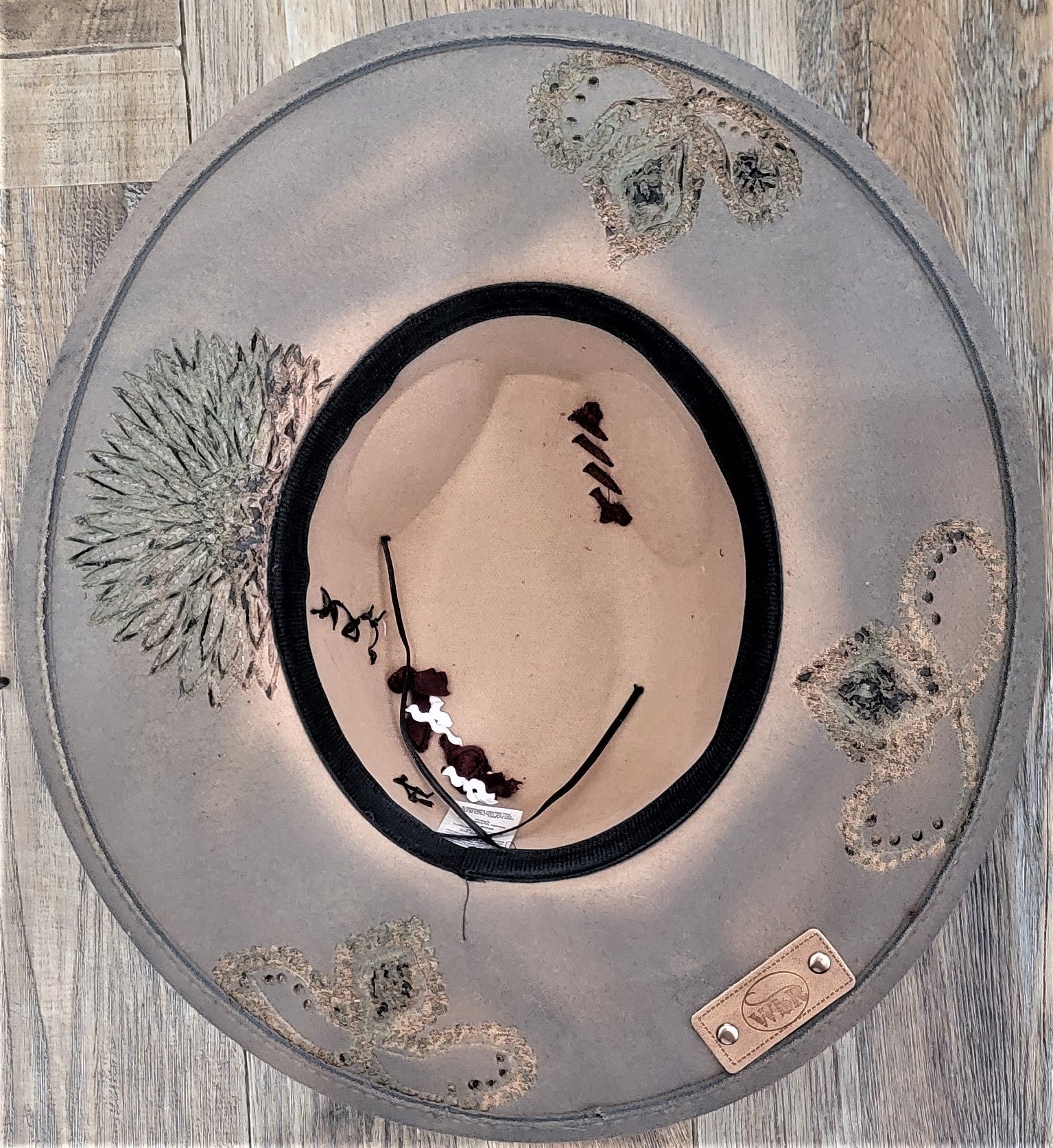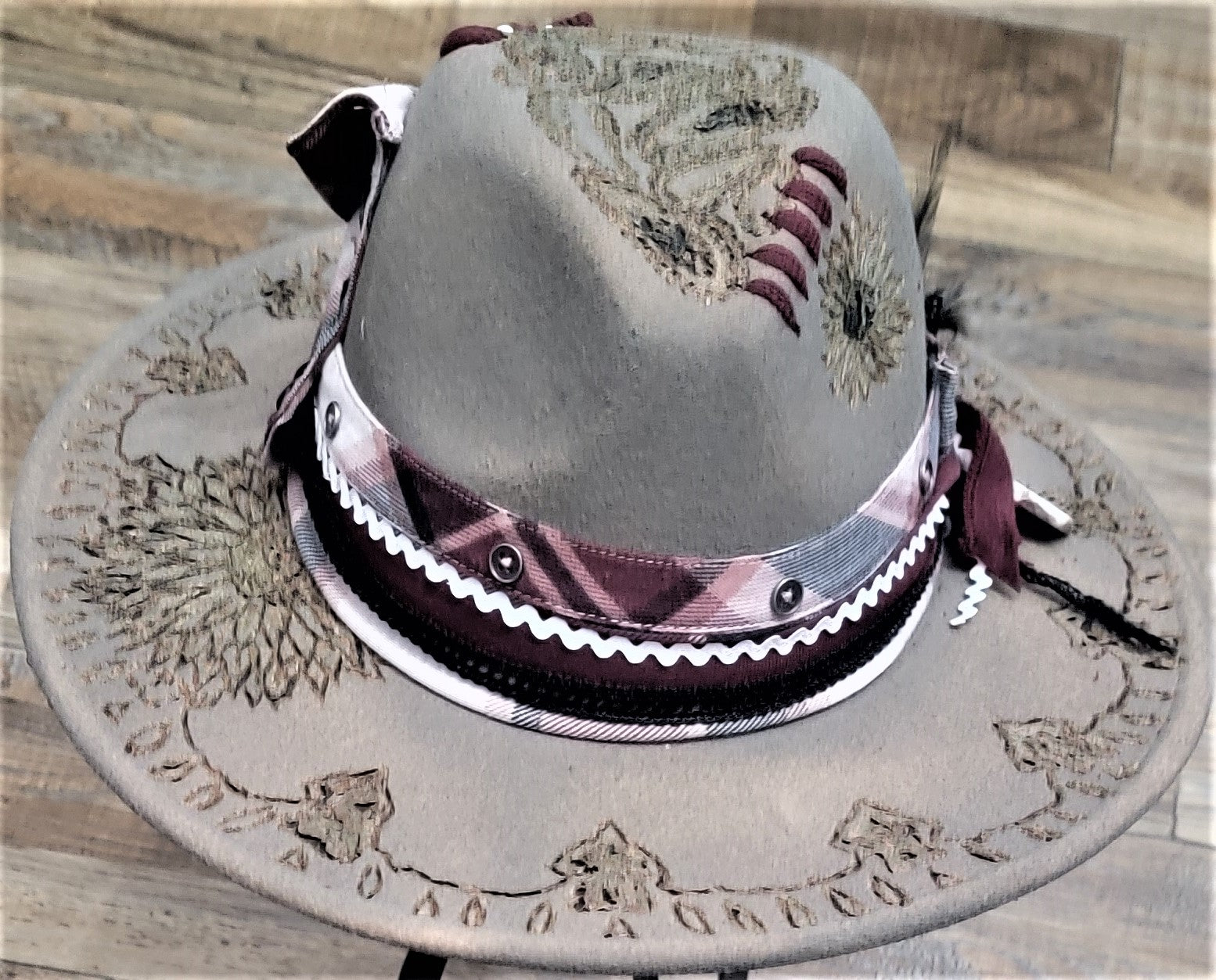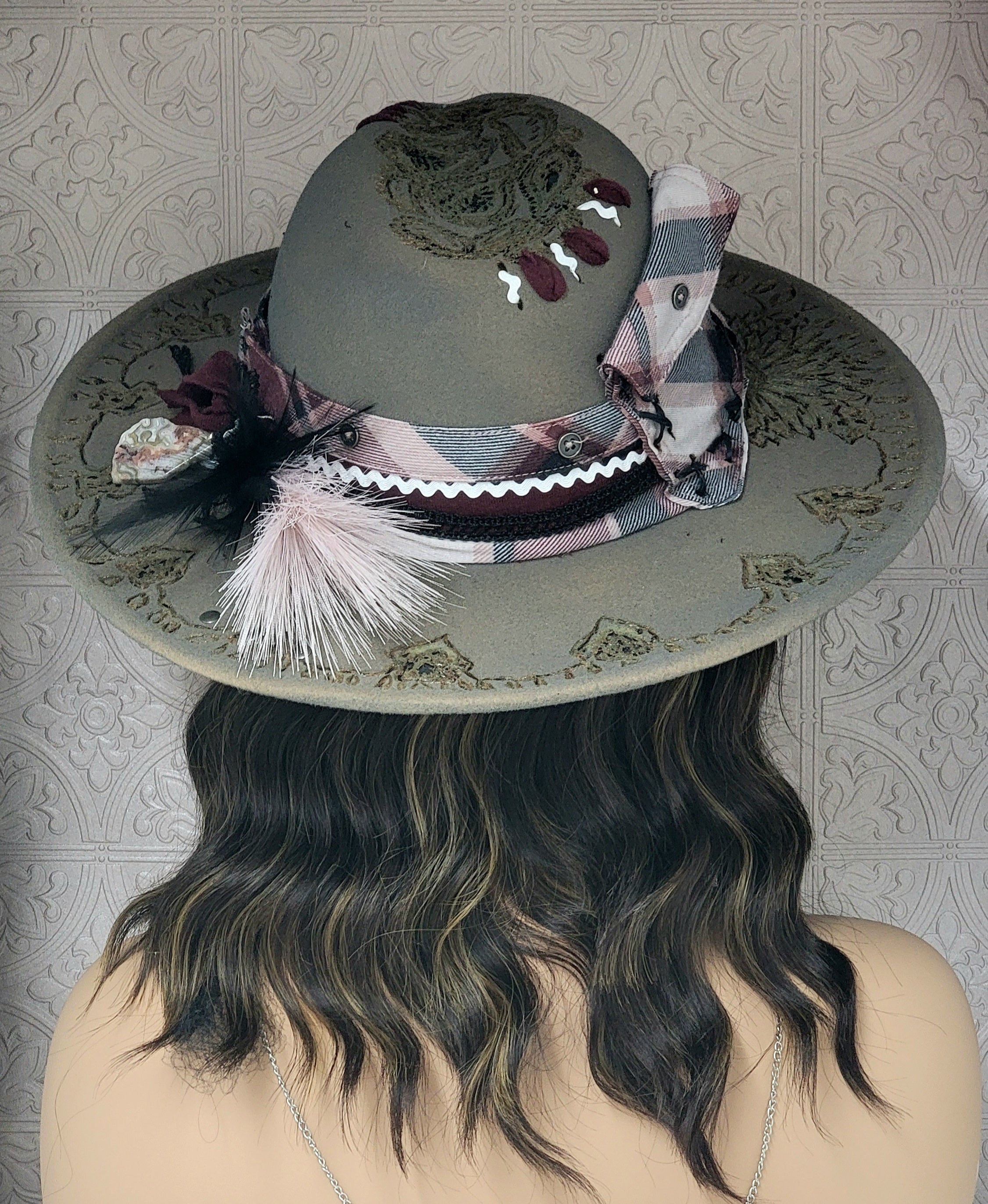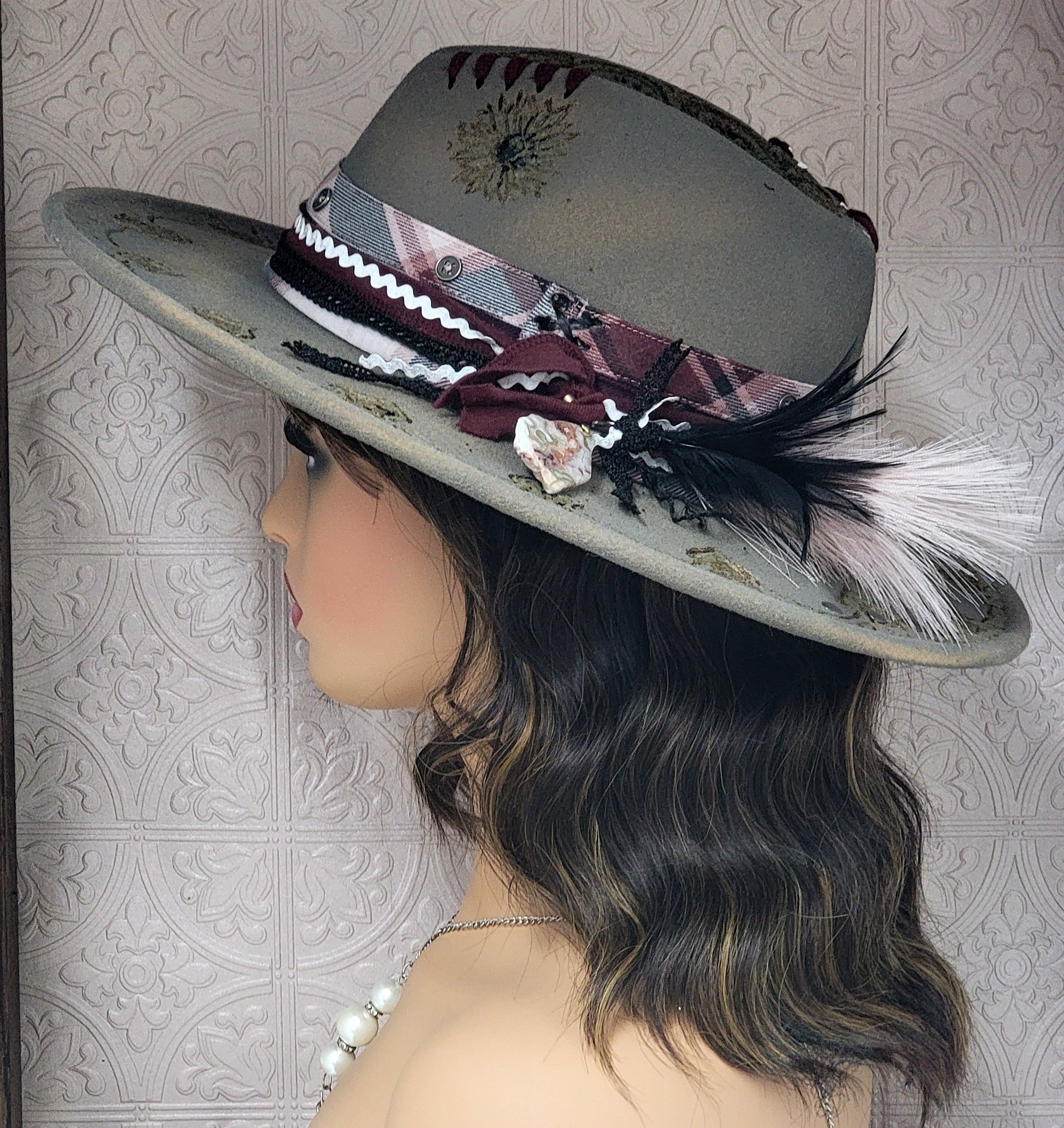 A true statement of rugged elegance, this one-of-a-kind hat blends rustic textures with whimsical accents. Its earthy taupe base is hand-detailed with embroidered floral and paisley-inspired patterns across the crown and brim, giving it a timeless artisanal touch. The hatband features a layered mix of plaid fabric, maroon trim, and classic white rickrack, secured with metallic rivets that add a hint of industrial edge.