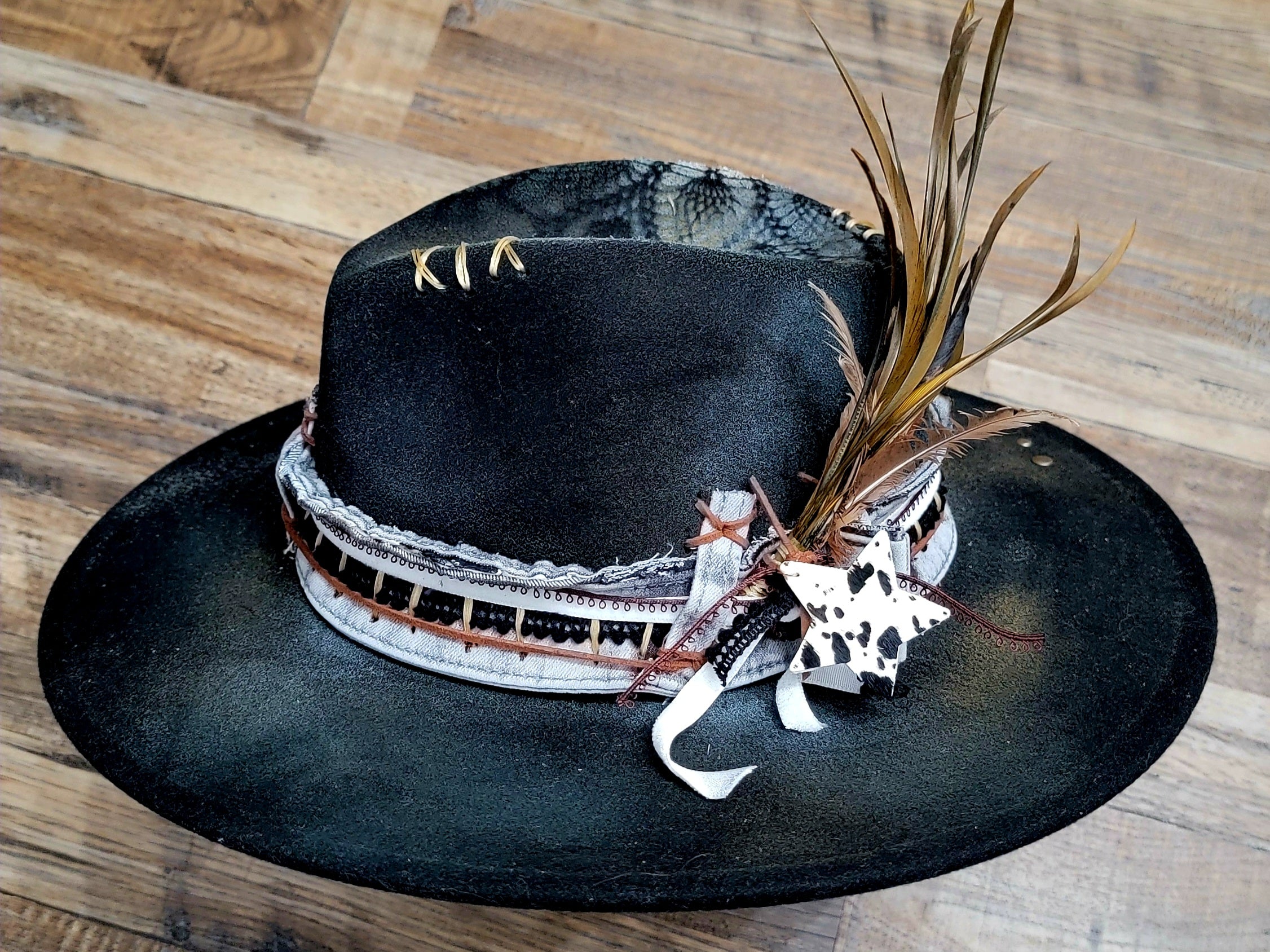 Accents: The hatband is layered with distressed denim, tooled leather, and stitched accents, finished with a star cut from cowhide and adorned with rustic lacing.