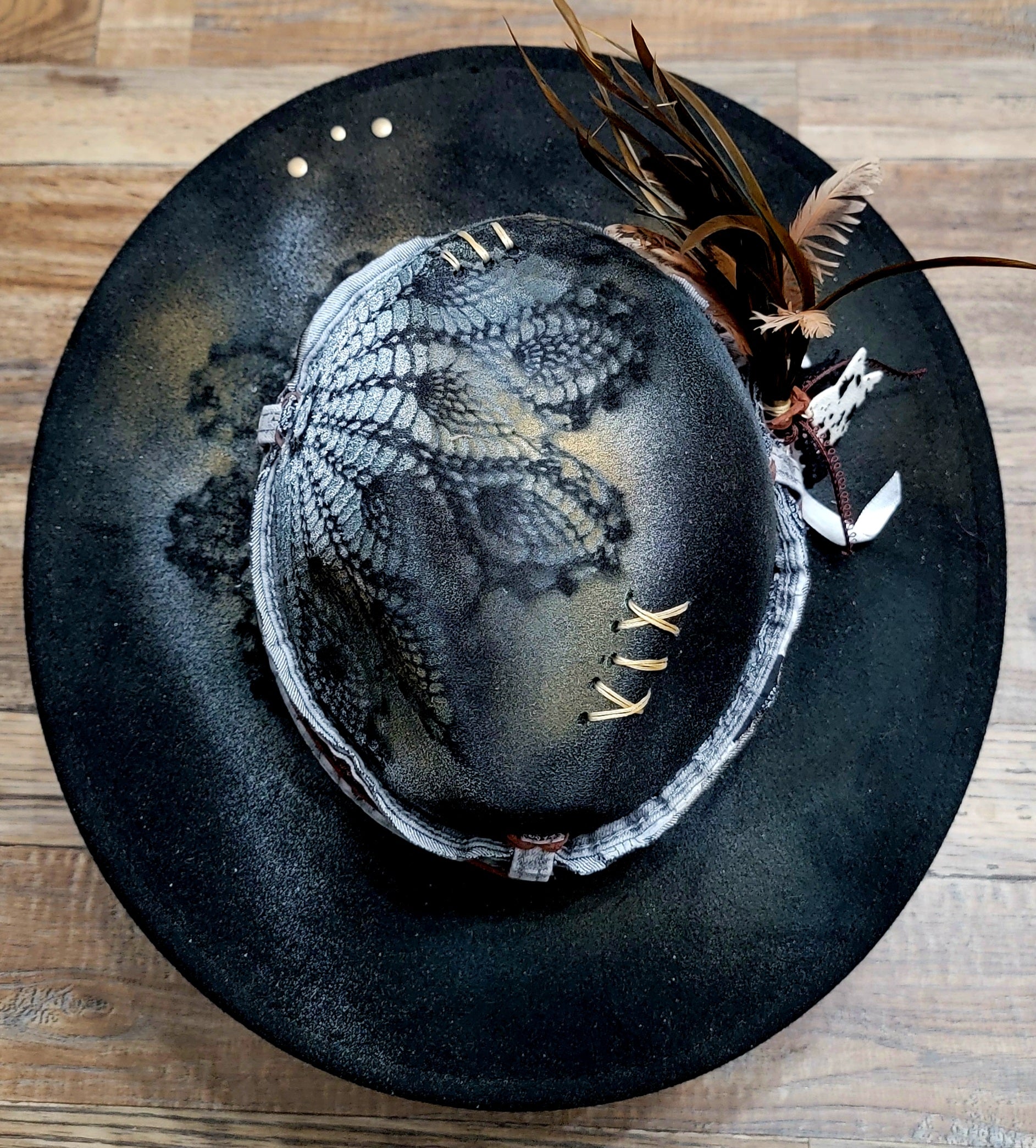 Design & Style: A sleek black base with a smoky hand-burnished finish, overlaid with striking lace-inspired detailing across the crown for a subtle yet powerful texture.