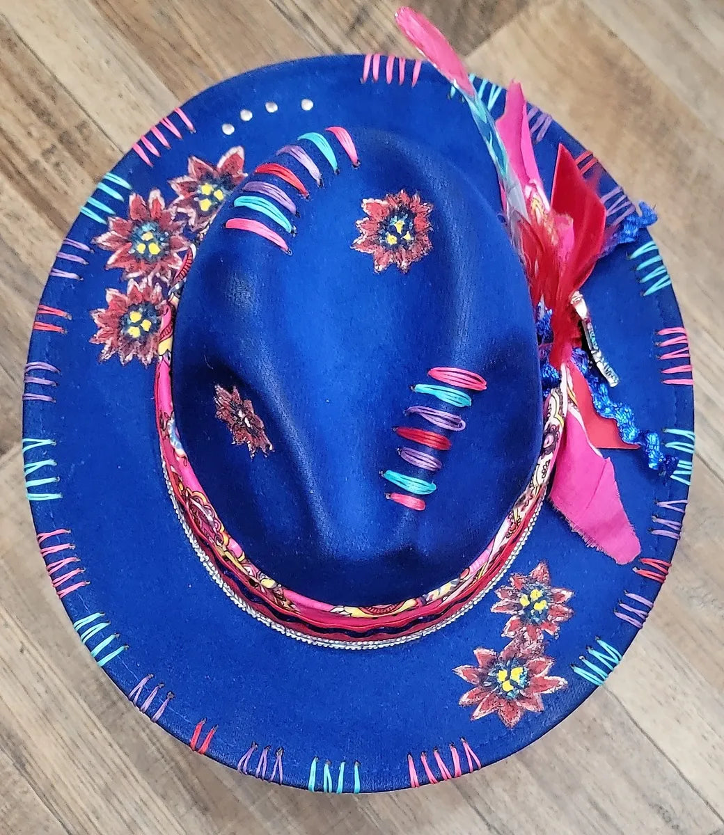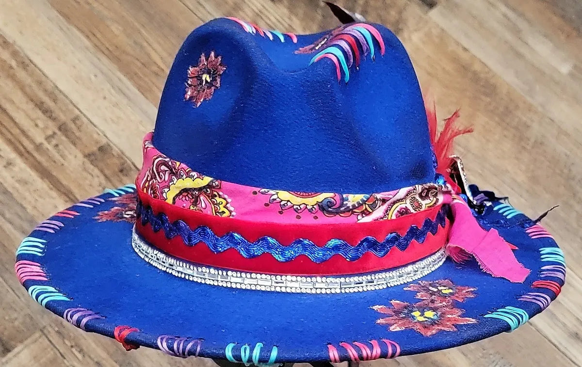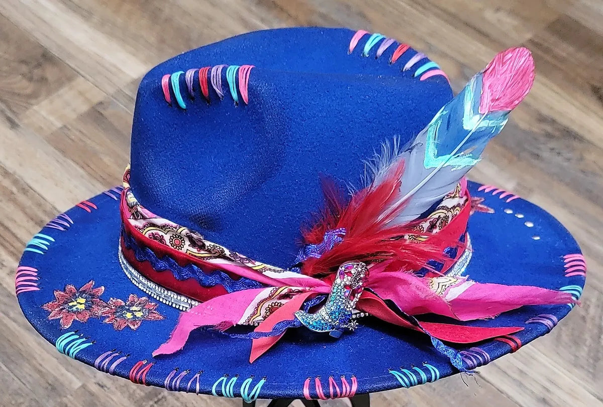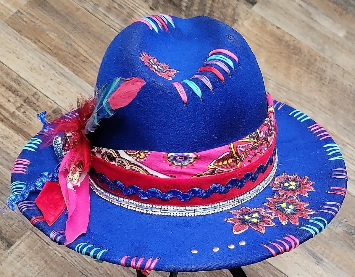 Daring, colorful, and unapologetically unique—the Royal Flush hat is a winning hand in wearable art. Built on a rich cobalt-blue base, this piece explodes with personality through hand-painted floral motifs, neon-thread stitching, and layered textures that celebrate bold self-expression.