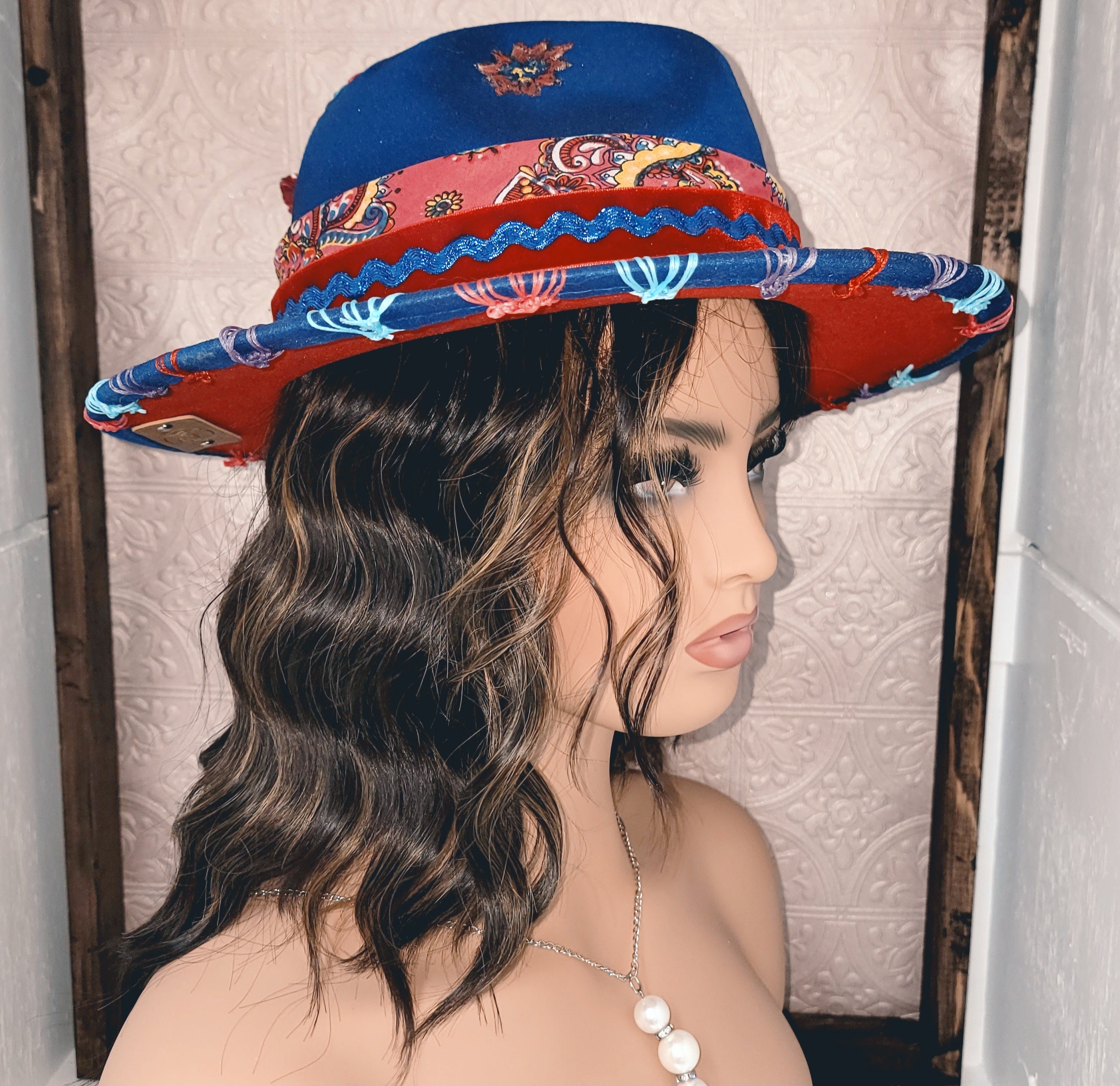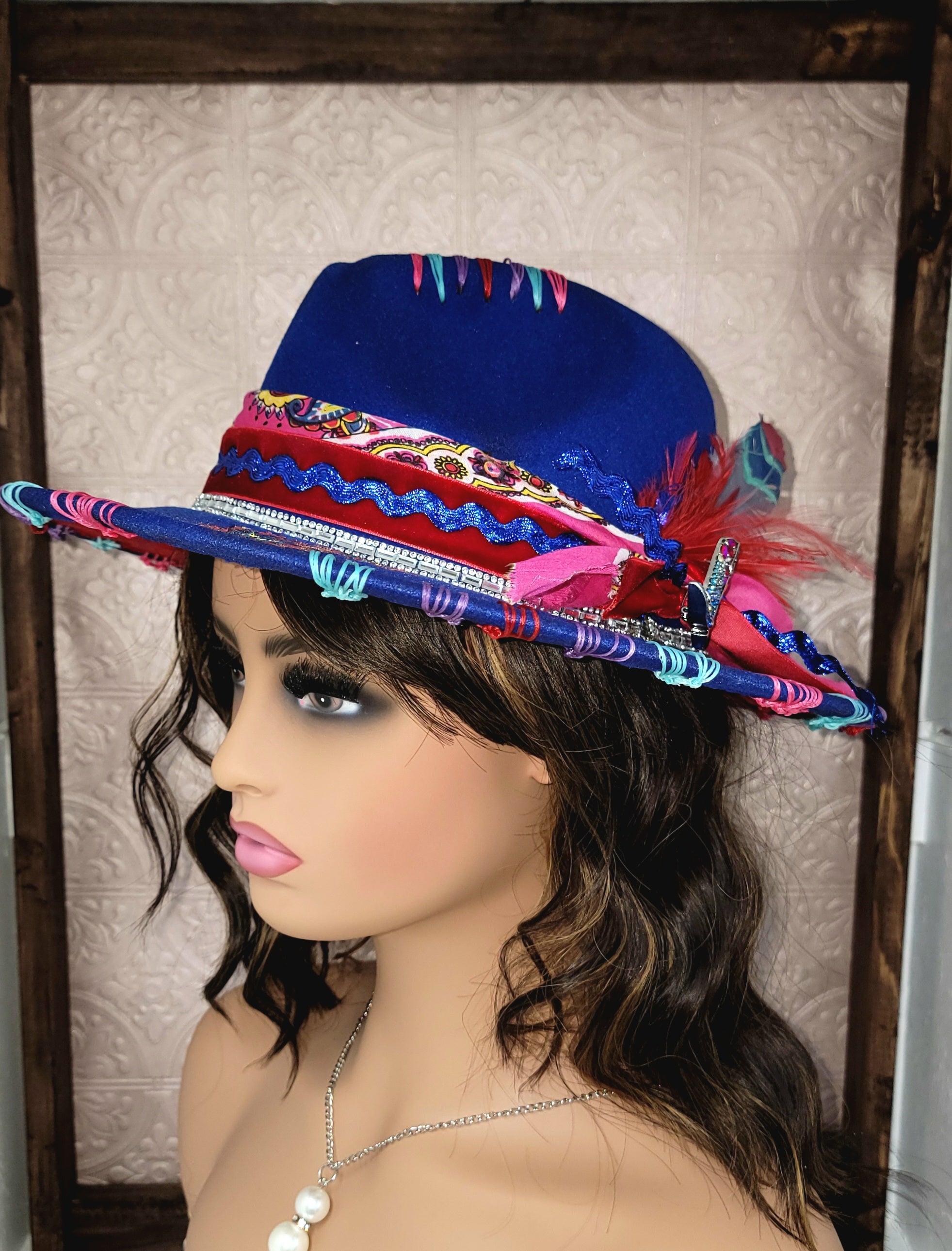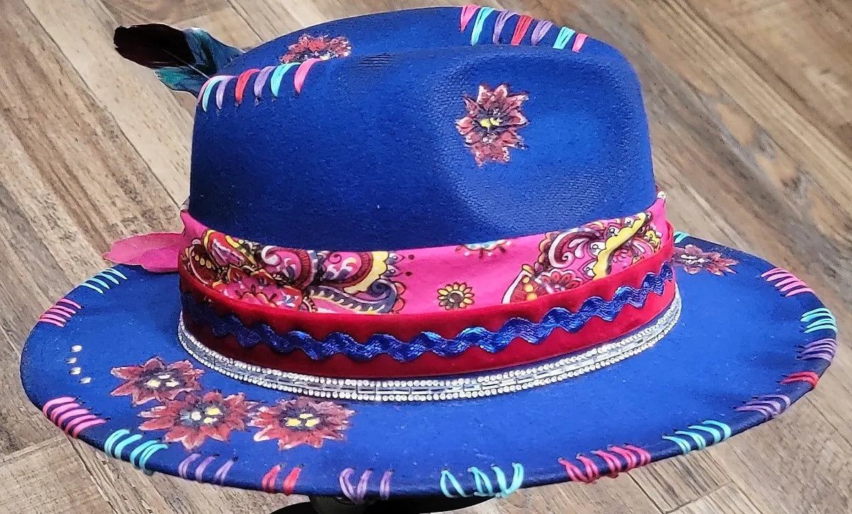 Daring, colorful, and unapologetically unique—the Royal Flush hat is a winning hand in wearable art. Built on a rich cobalt-blue base, this piece explodes with personality through hand-painted floral motifs, neon-thread stitching, and layered textures that celebrate bold self-expression.