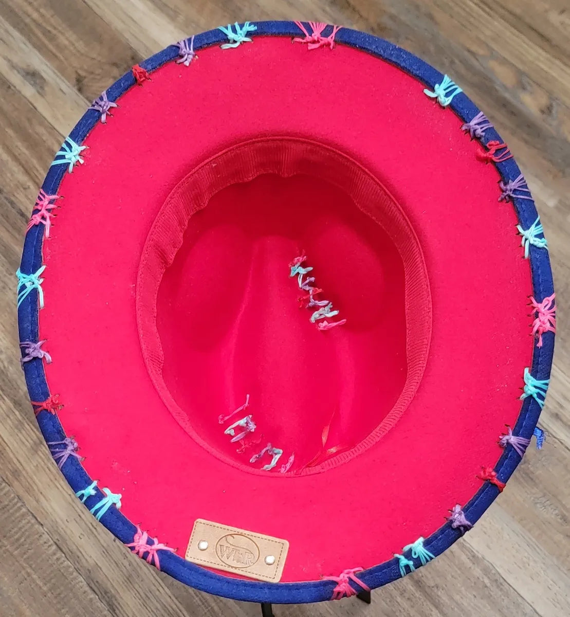 Even the underbrim is given a pop of color with a vivid red lining, tied together with rainbow stitches for a look that’s just as stunning when tipped or hung. Bold, playful, and brimming with energy—Royal Flush is made for those who always bet on themselves.