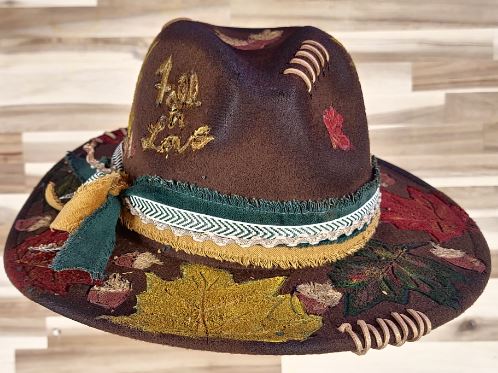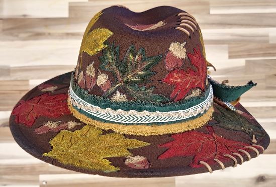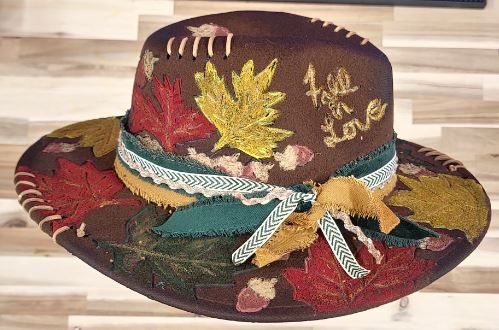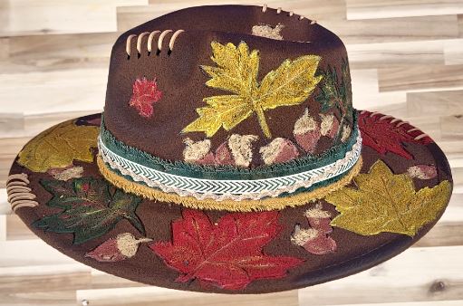 The Fall in Love hat captures the vibrant spirit of autumn with its rich brown base, hand-decorated with bold embroidered leaves in shades of crimson, gold, and forest green. Each leaf is carefully burned then painted, creating a tapestry of color that reflects the beauty of falling foliage.