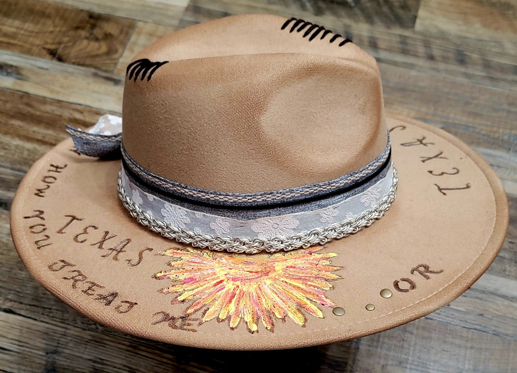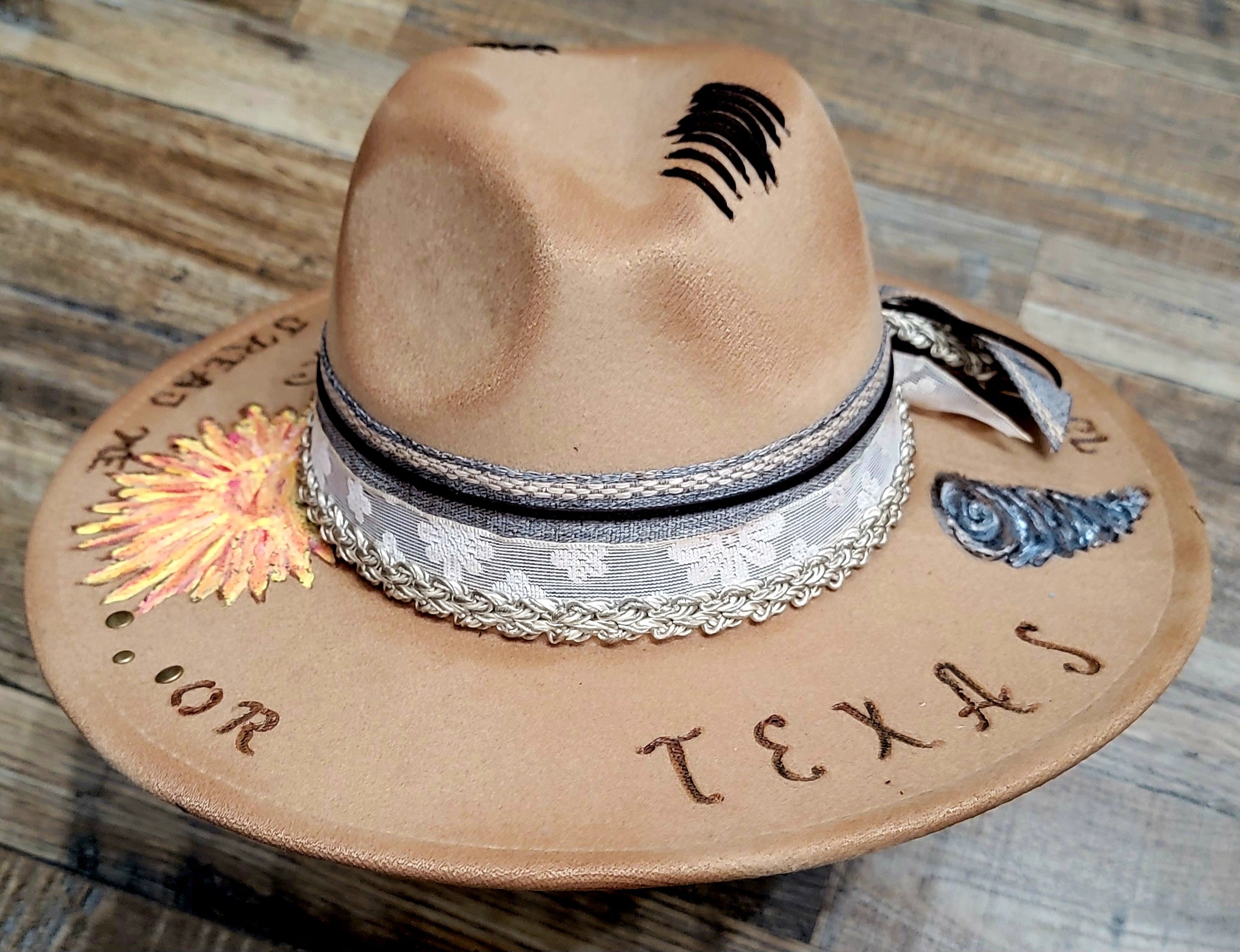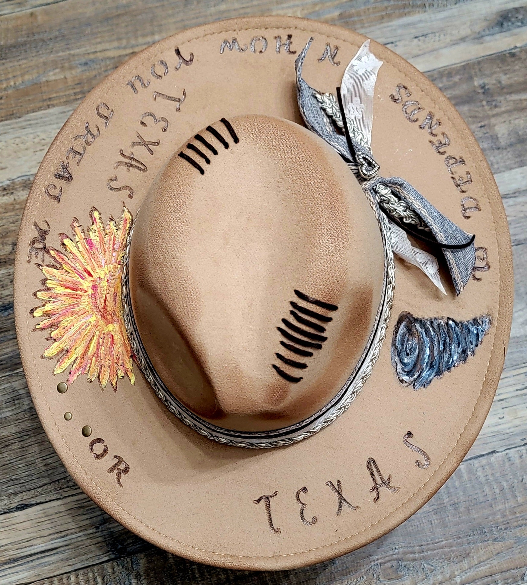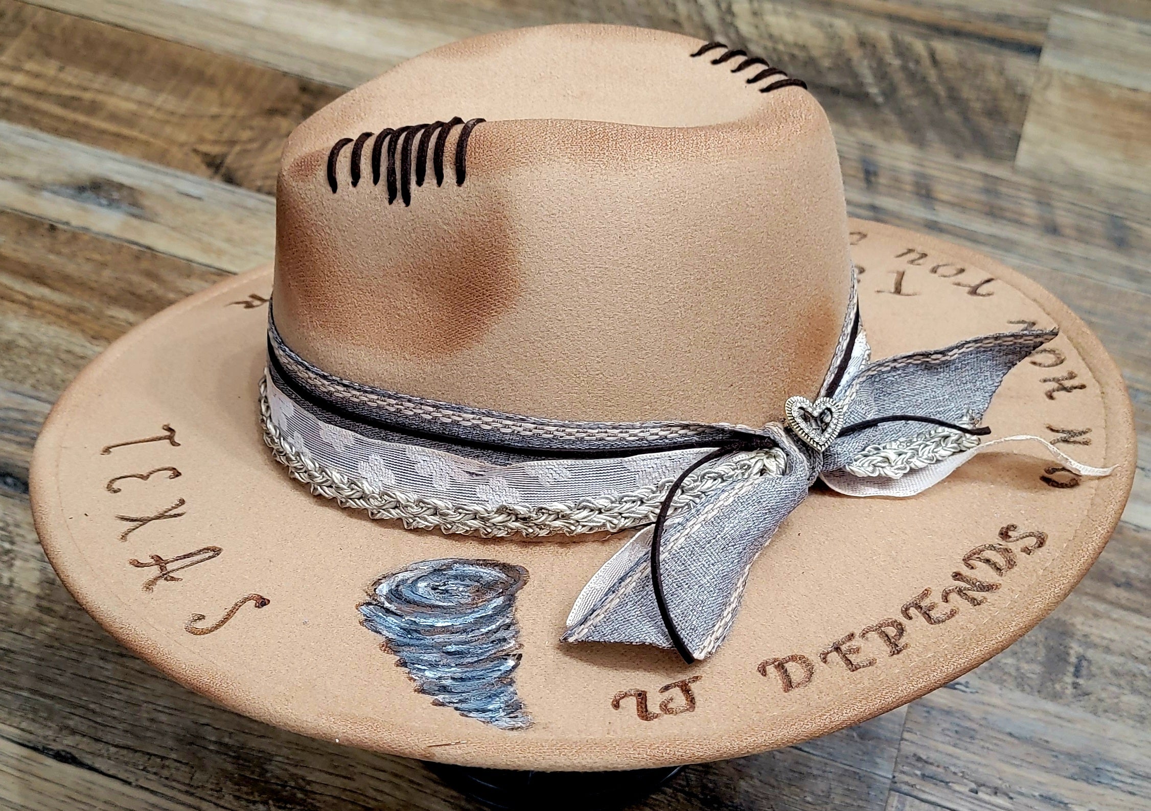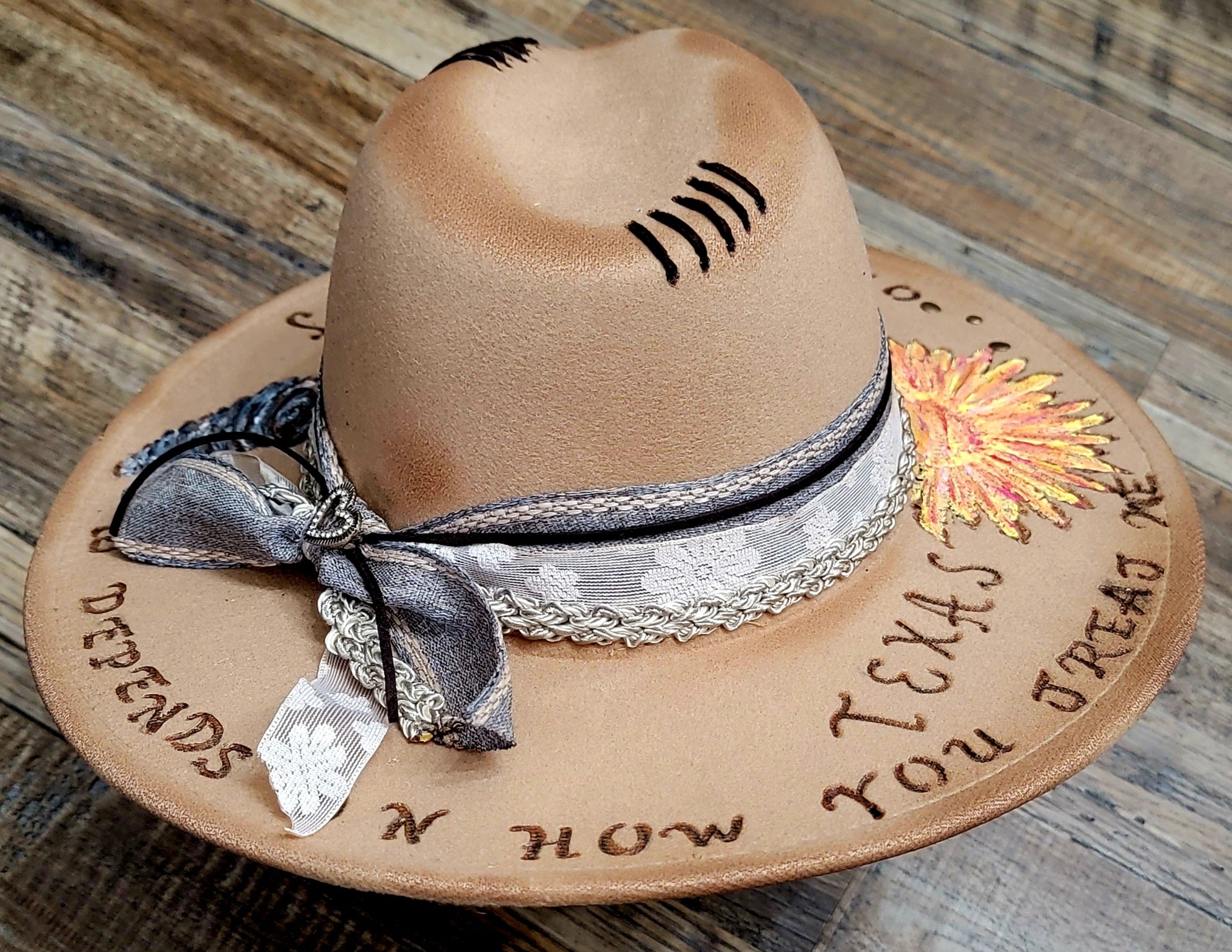 Hand-burned lettering around the brim reads: “Texas… it depends on how you treat me,” capturing the wild, untamed spirit of the Lone Star State.
