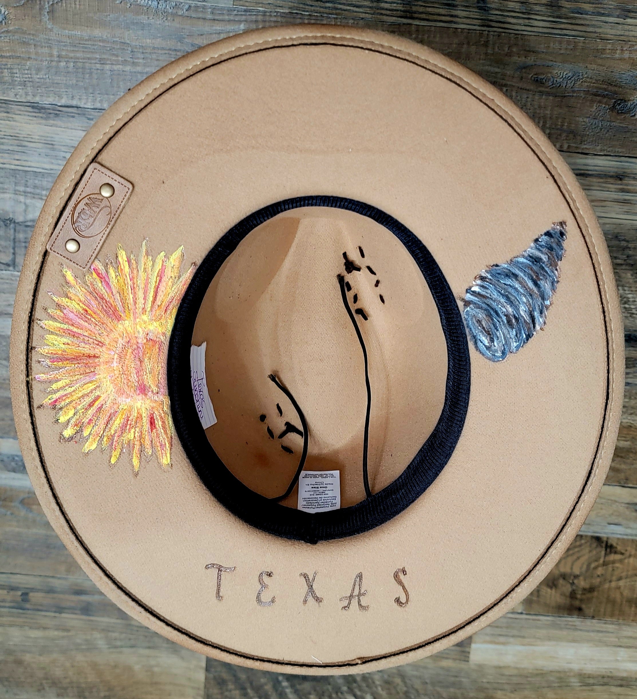 Texas Girl Collection: Bold, spirited, and full of Texas pride — the Sunshine or Tornado rancher hat is a wearable story of resilience and strength. Crafted in a warm sand-tan felt, this one-of-a-kind piece blends elegance with rugged edge.
