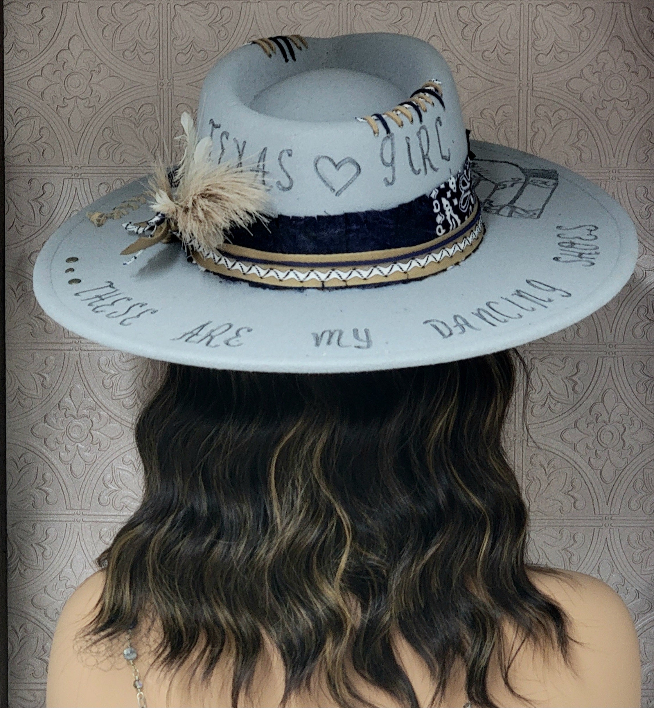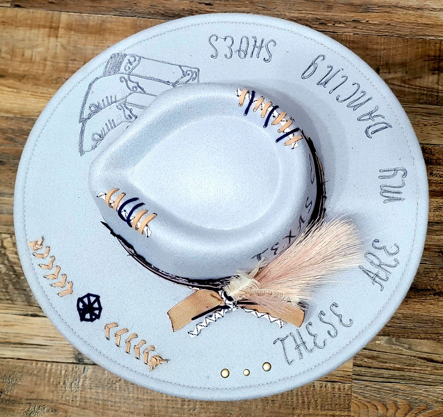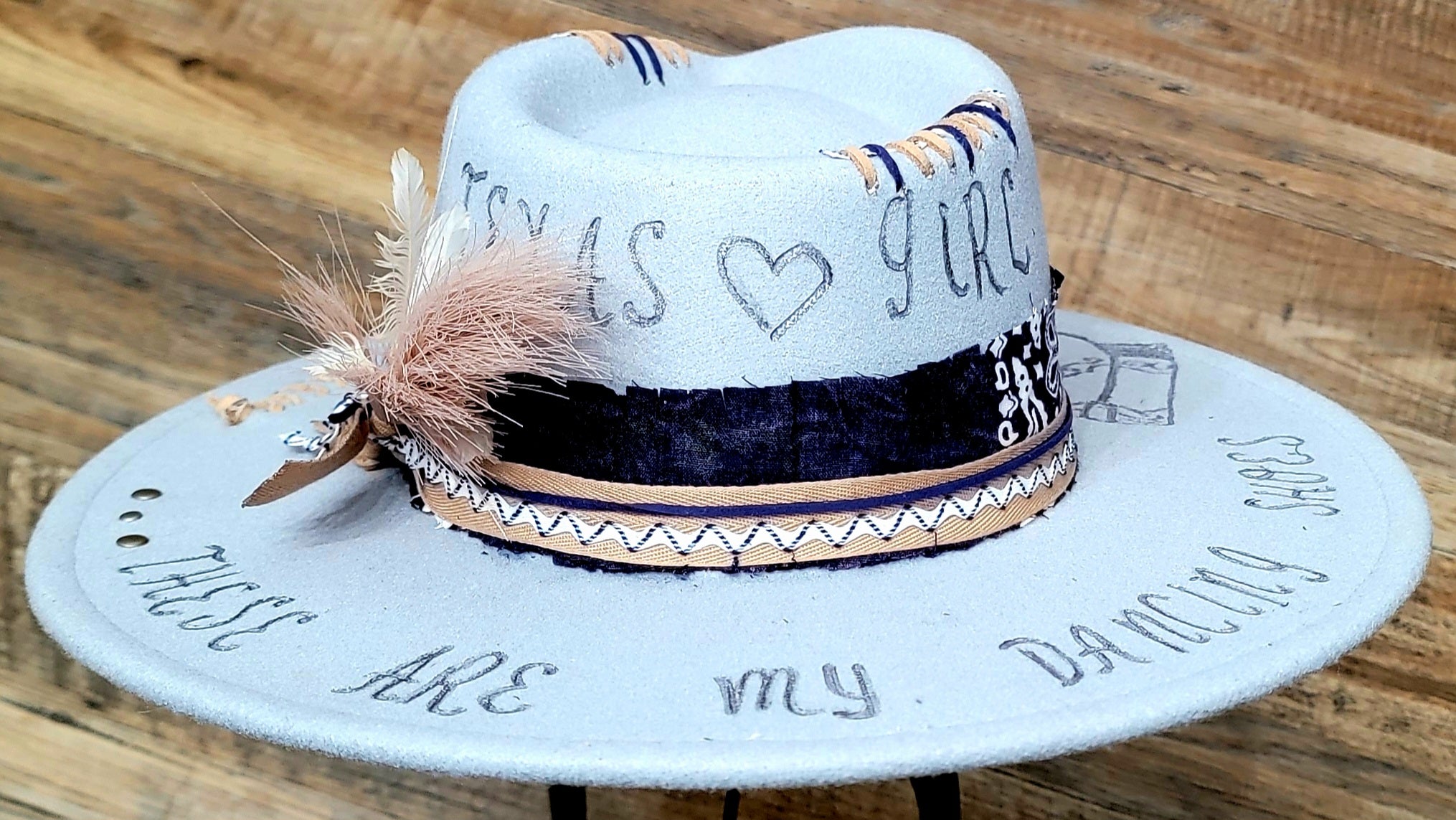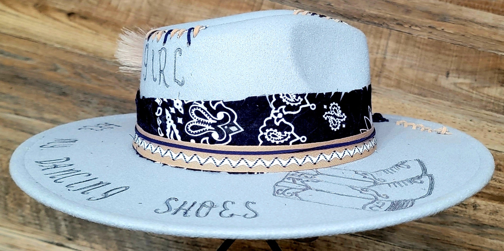 This smoky blue poly-blend hat features freehand burned details that celebrate southern charm, including a hand-drawn pair of cowboy boots and the phrase “These Are My Dancing Shoes” etched across the brim. Tan and navy stitching accents the crown, while the band is wrapped with a navy paisley fabric, layered ribbon, and zigzag trim for that authentic western flair.