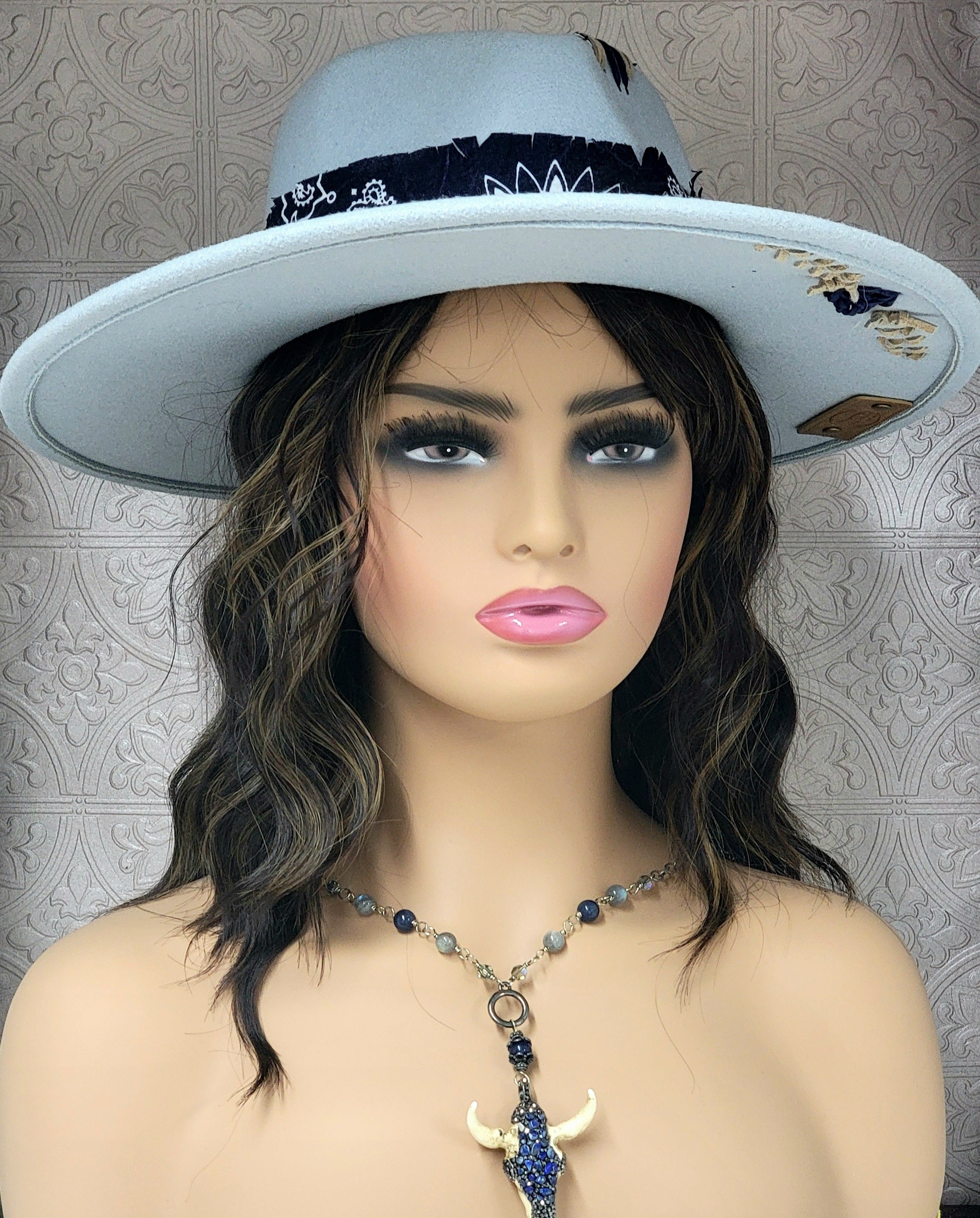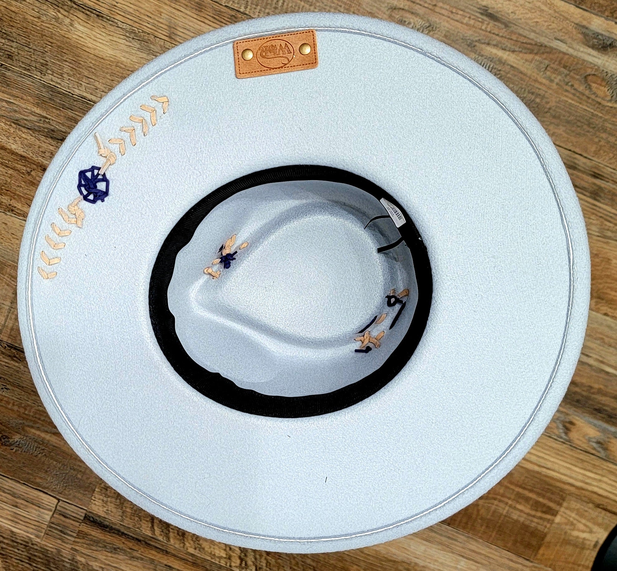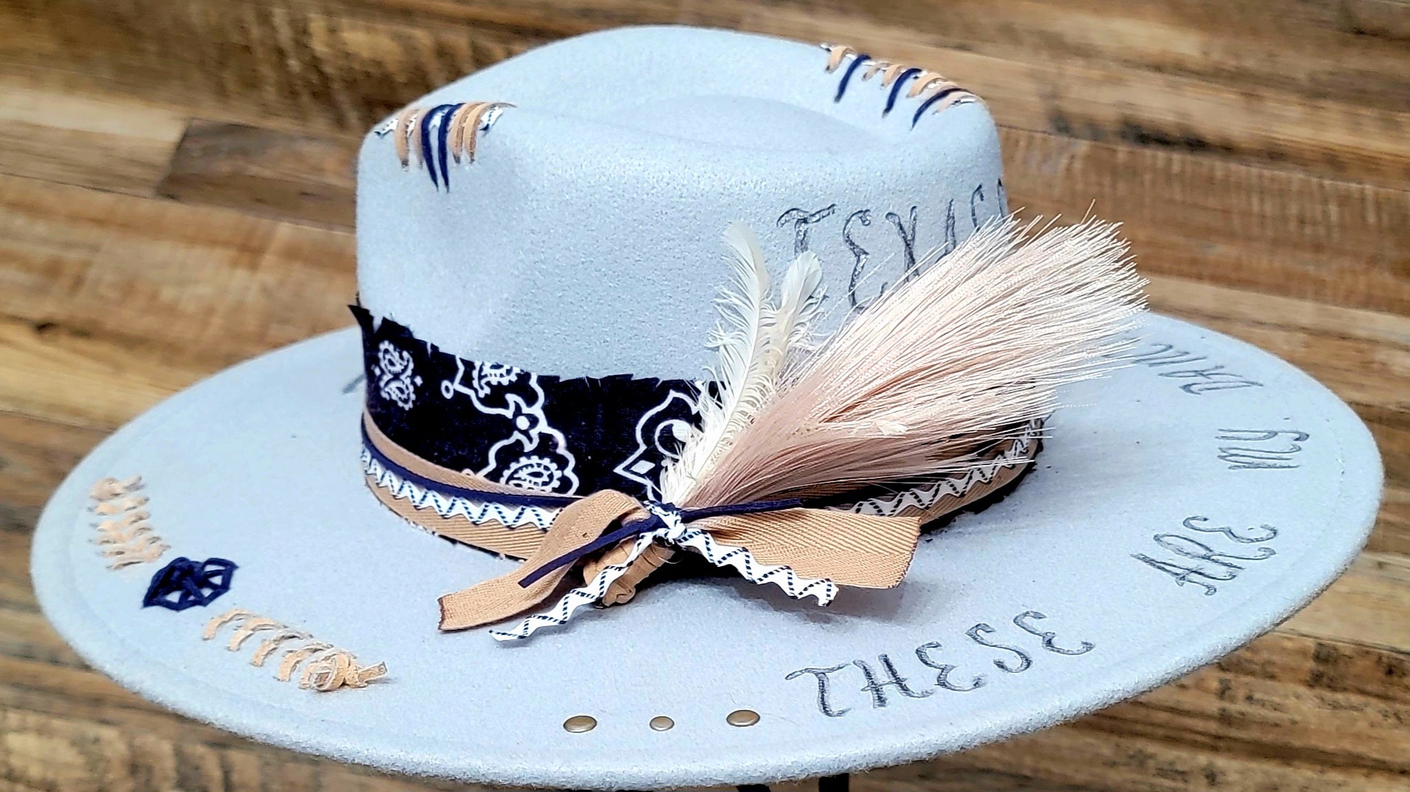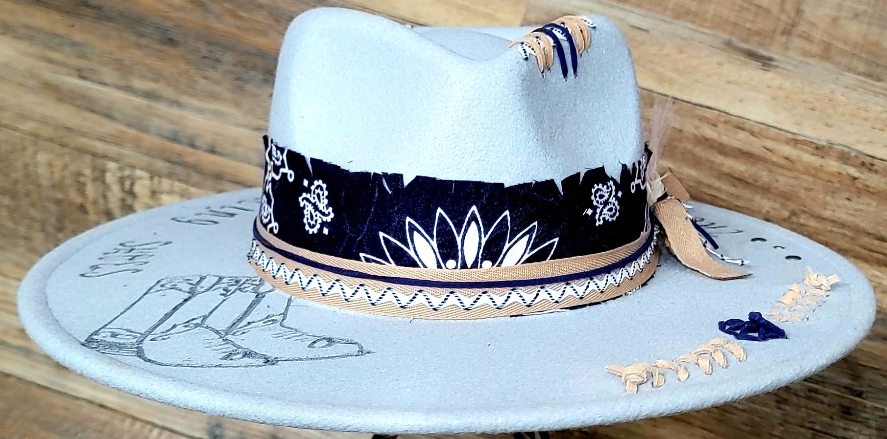 This smoky blue poly-blend hat features freehand burned details that celebrate southern charm, including a hand-drawn pair of cowboy boots and the phrase “These Are My Dancing Shoes” etched across the brim. Tan and navy stitching accents the crown, while the band is wrapped with a navy paisley fabric, layered ribbon, and zigzag trim for that authentic western flair.