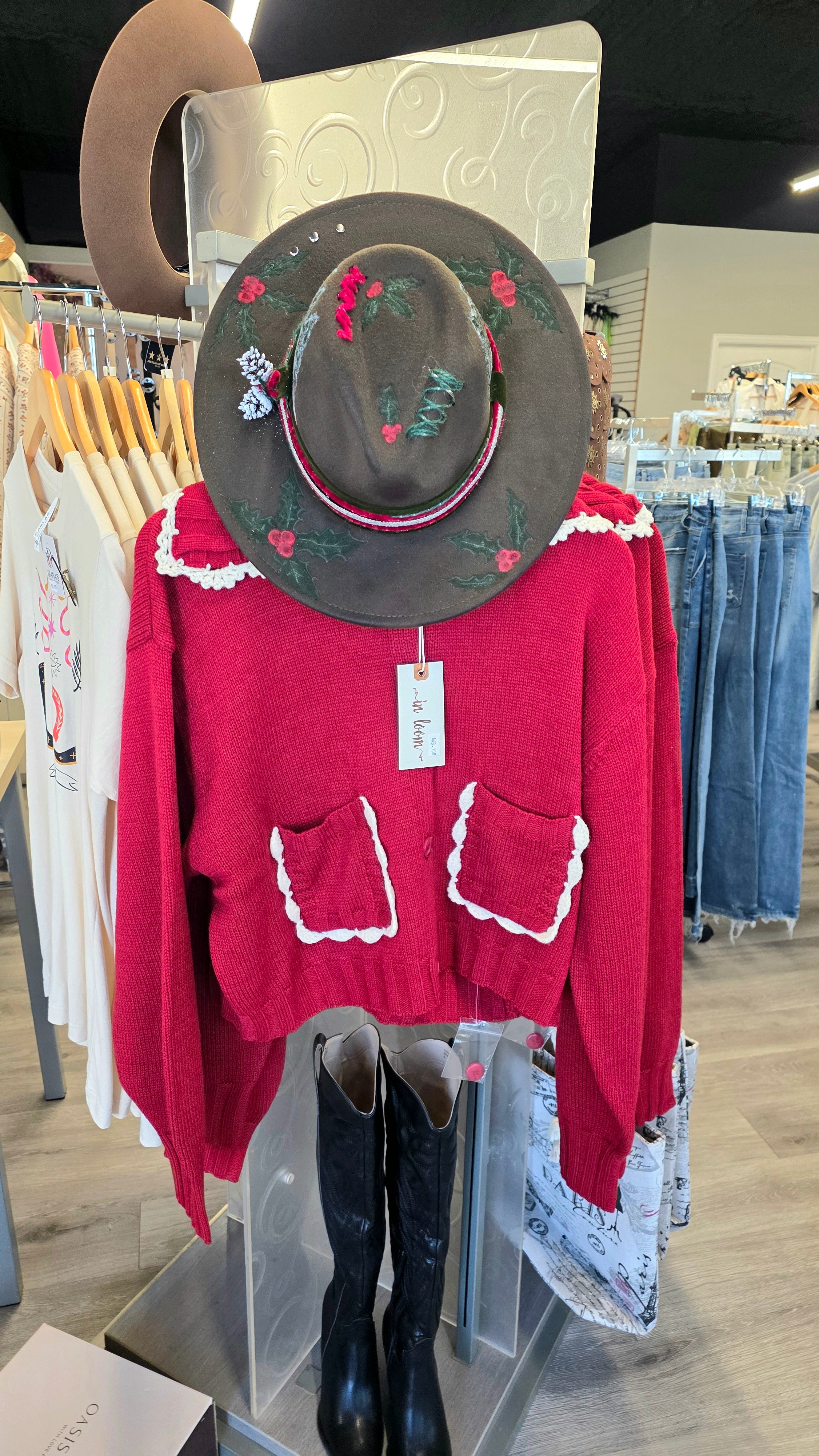 Step into the magic of the season with our Christmas in the Pines hat. This enchanting piece features hand-burned and painted evergreen trees and festive holly, bringing cozy holiday charm to every outfit. The perfect accessory for celebrating Christmas in style while spreading cheer wherever you go!