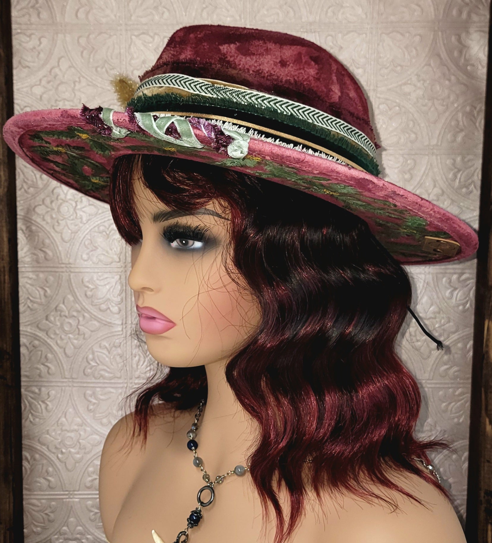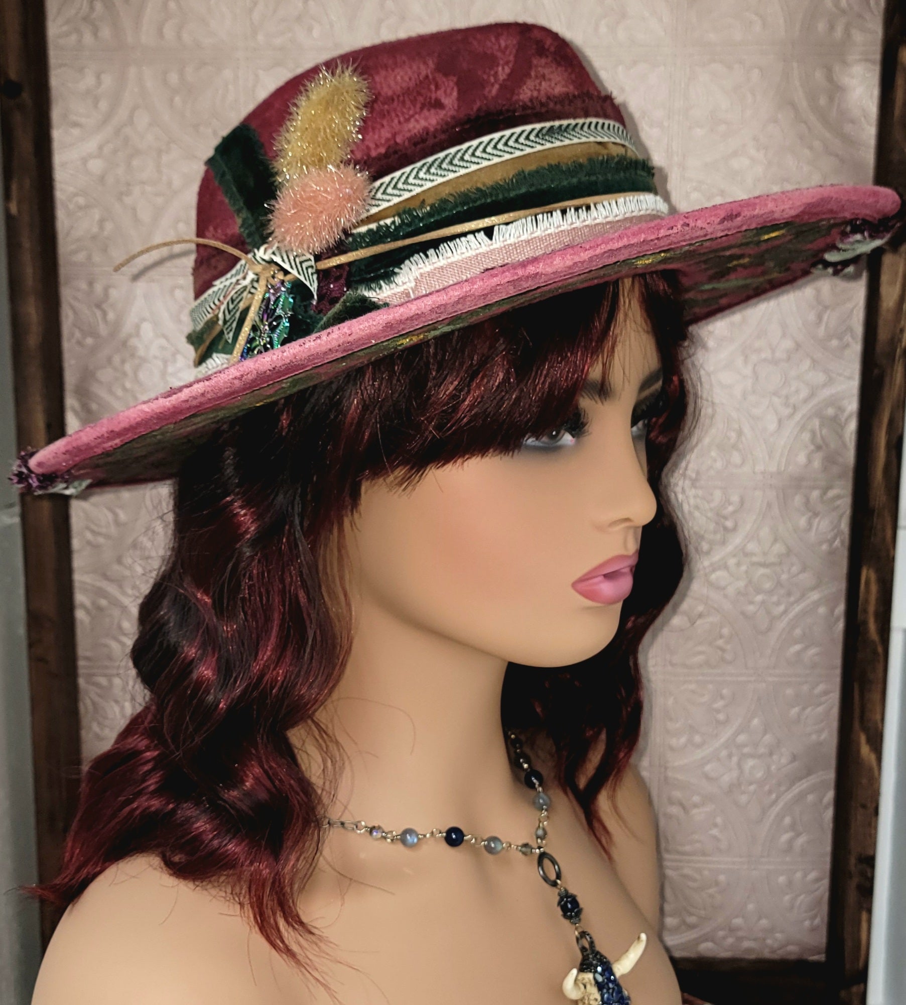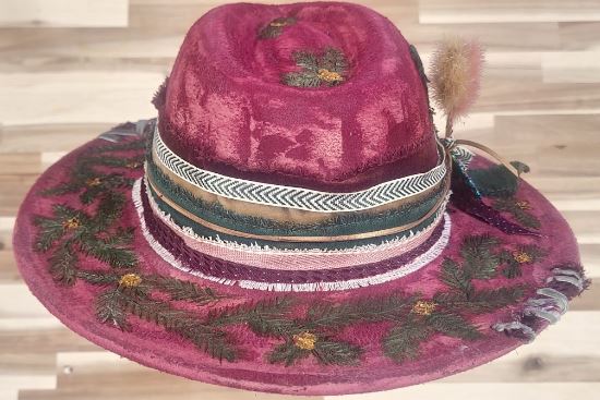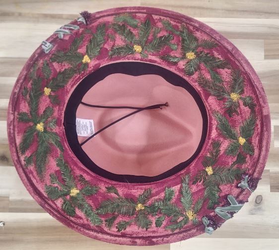 Celebrate the magic of winter with our Holly hat, a vibrant deep red piece that radiates festive charm. Hand-decorated with evergreen accents, delicate holly-inspired details, and finished with soft feathers and layered ribbons, this hat is a true seasonal statement. A shimmering charm adds the perfect touch of holiday sparkle, making Holly your go-to accessory for winter gatherings and festive cheer.